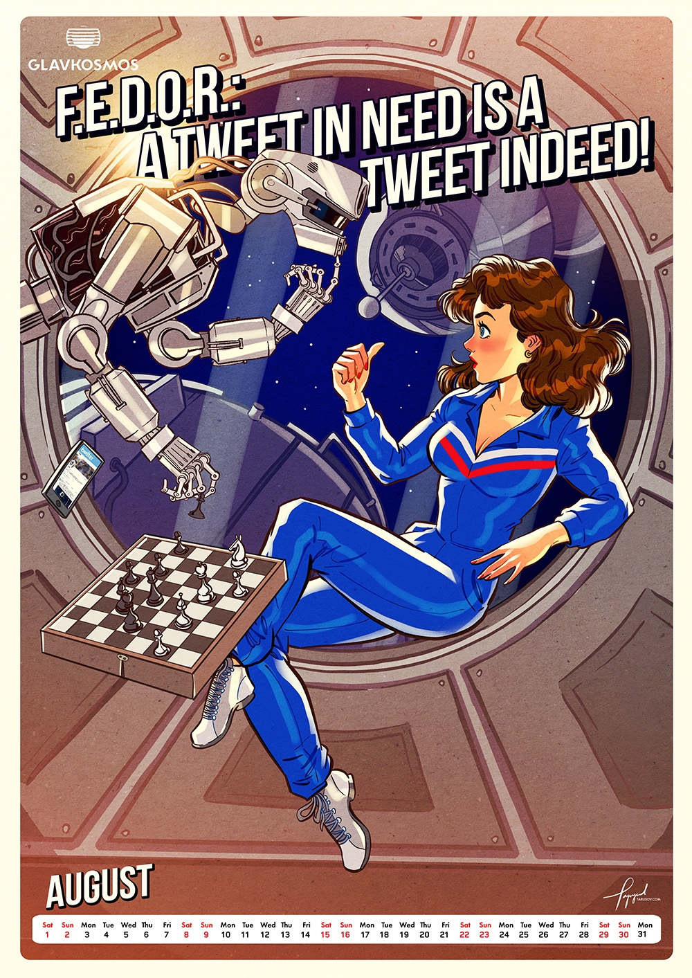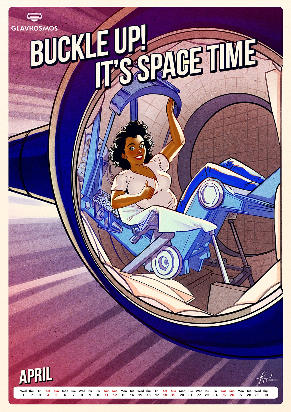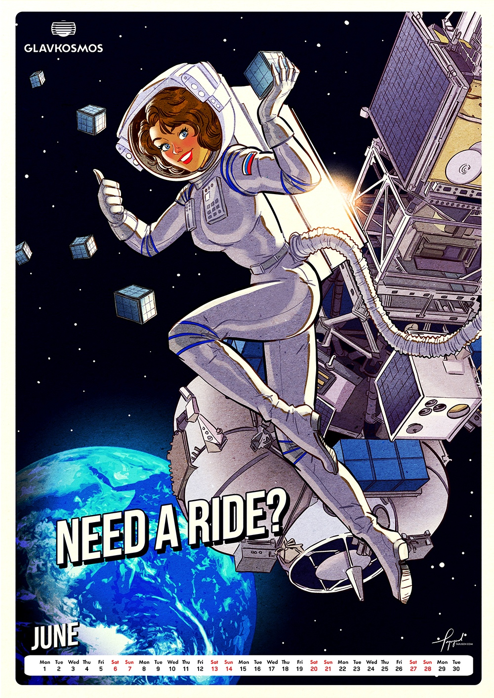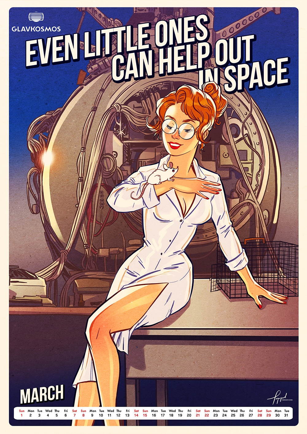 Главкосомос, дочернее предприятие Роскосмоса, привлекло для этого известного иллюстратора Андрея Тарусова. Последний посвятил много времени и сил созданию яркого календаря на следующий год в стиле американской графики пинап середины прошлого века, изображающей сексапильных девушек за серьёзной работой в космосе и на Земле.