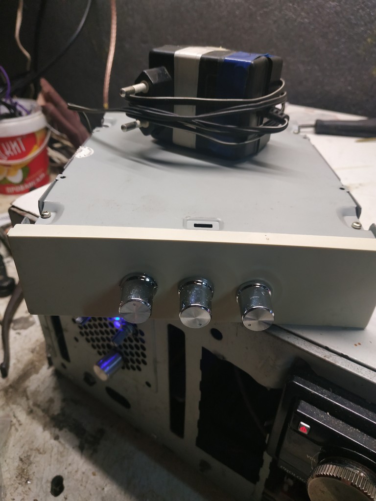 Но блока с нужным штекером не оказалось, потому решил провода питания припаять. А на новой панели сделал всего три дырки под крутилки.