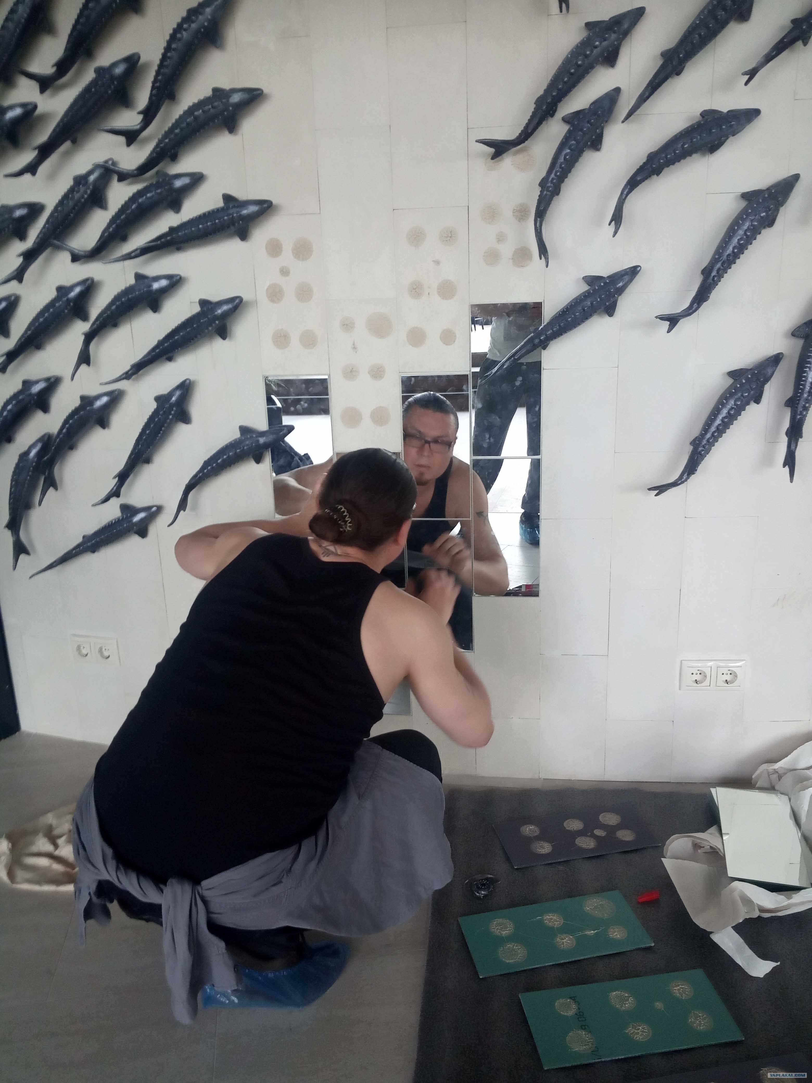 Едем на монтаж. Призвал друга на помощь. Еще помимо рыб нужно сделать зеркальную полосу в центре