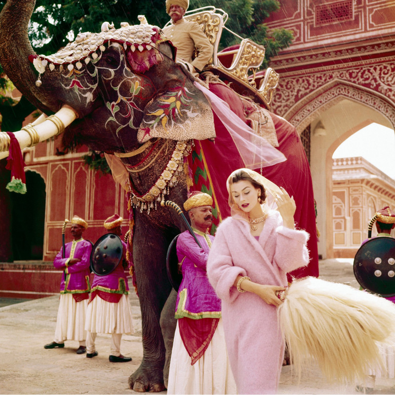 Ирландская модель Энн Ганнинг у дворца в Джайпуре, Индия, 1956 год.