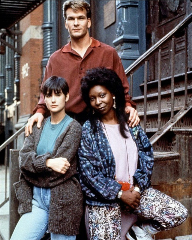 Патрик Суэйзи, Деми Мур и Вупи Голдберг во время съемок фильма «Призрак». 1990