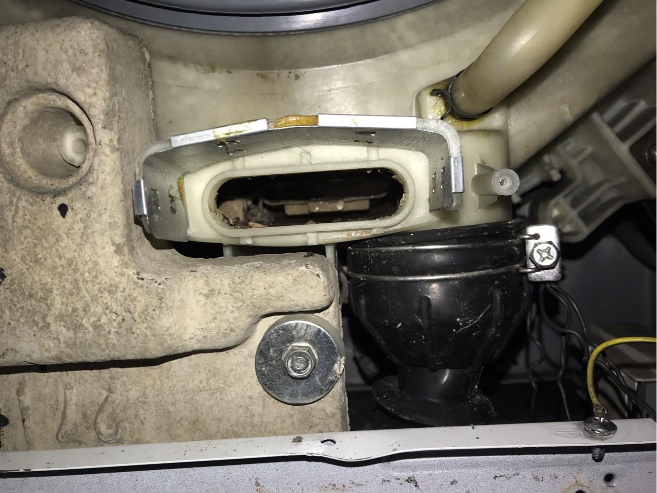 Снимаем у машины всю морду, отделяем круглую резинку и вот он, торец тэна. Отсоединив провода, откручиваем гайку. Потом нужно нажать на винт и аккуратно вытащить неисправный тен, не повредив пластиковый барабан.