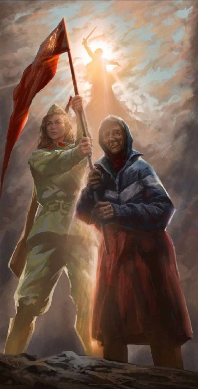 Ну тут смысл такой, что бабушка в прошлом девушкой, воевала в Великую Отечественную. И тут она молодая, и пожилая.