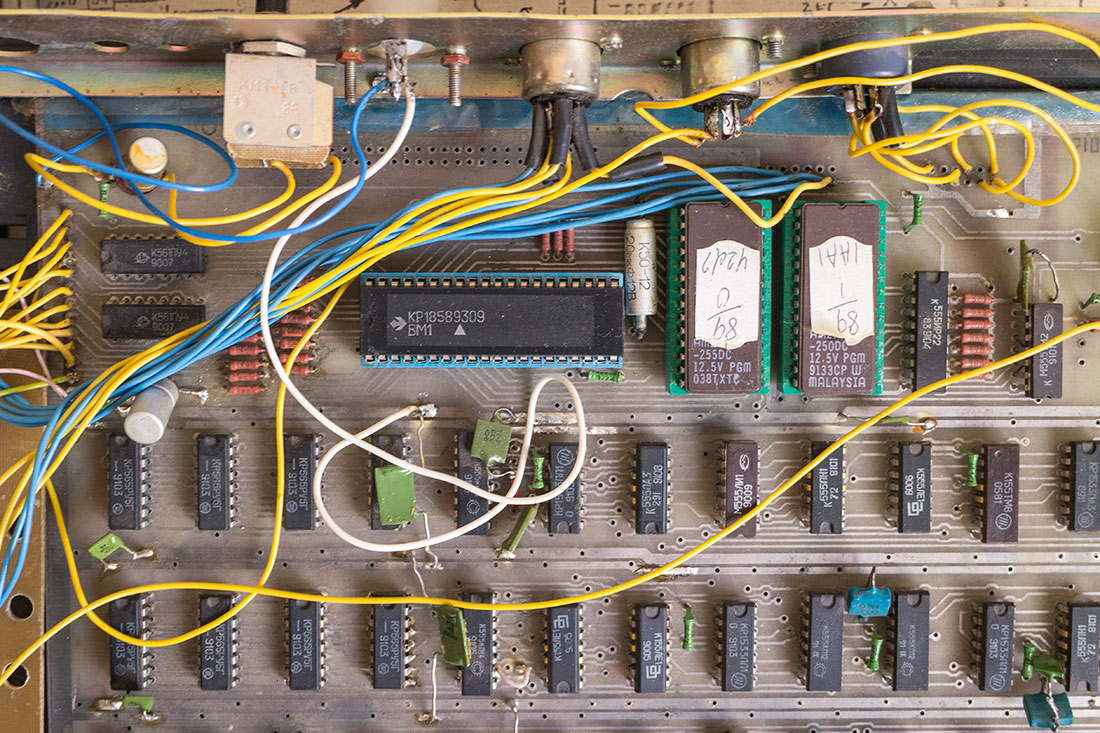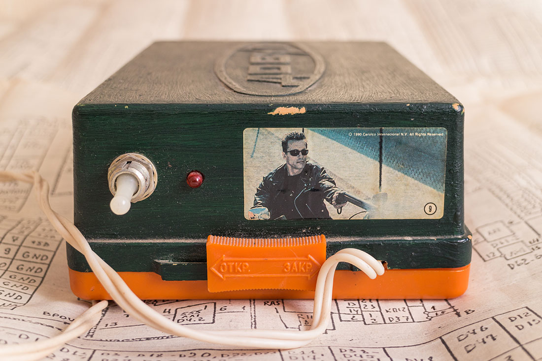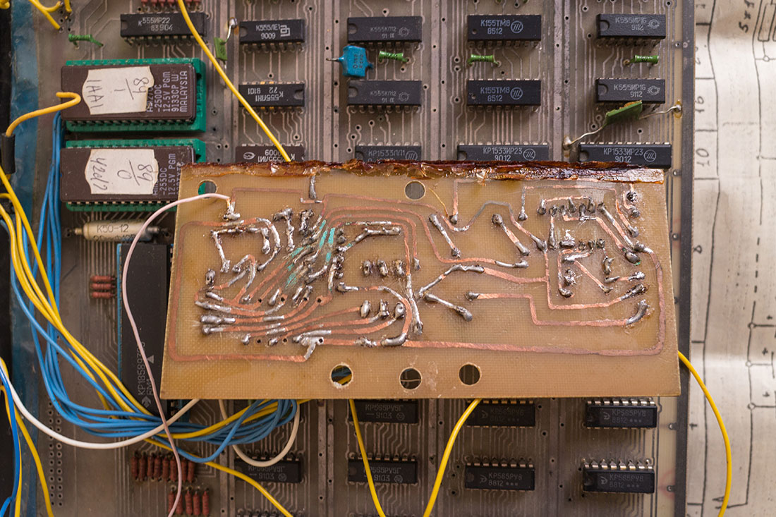 7. Плата сопряжения тоже в комплект не входила, поэтому пришлось изготавливать её самостоятельно. Реактивы для травления являлись жутким дефицитом, в магазинах не продавались, поэтому в ход шли народные средства. Дорожки рисовались женским лаком для ногтей, а травление проводилось при помощи смеси медного купороса с поваренной солью. Но это долгий метод, недели две пришлось плату в колдунском растворе мариновать.