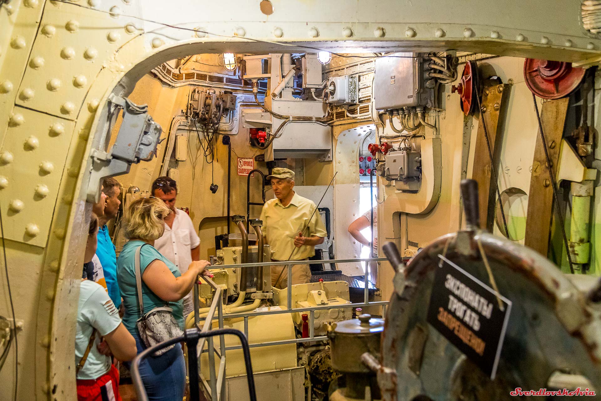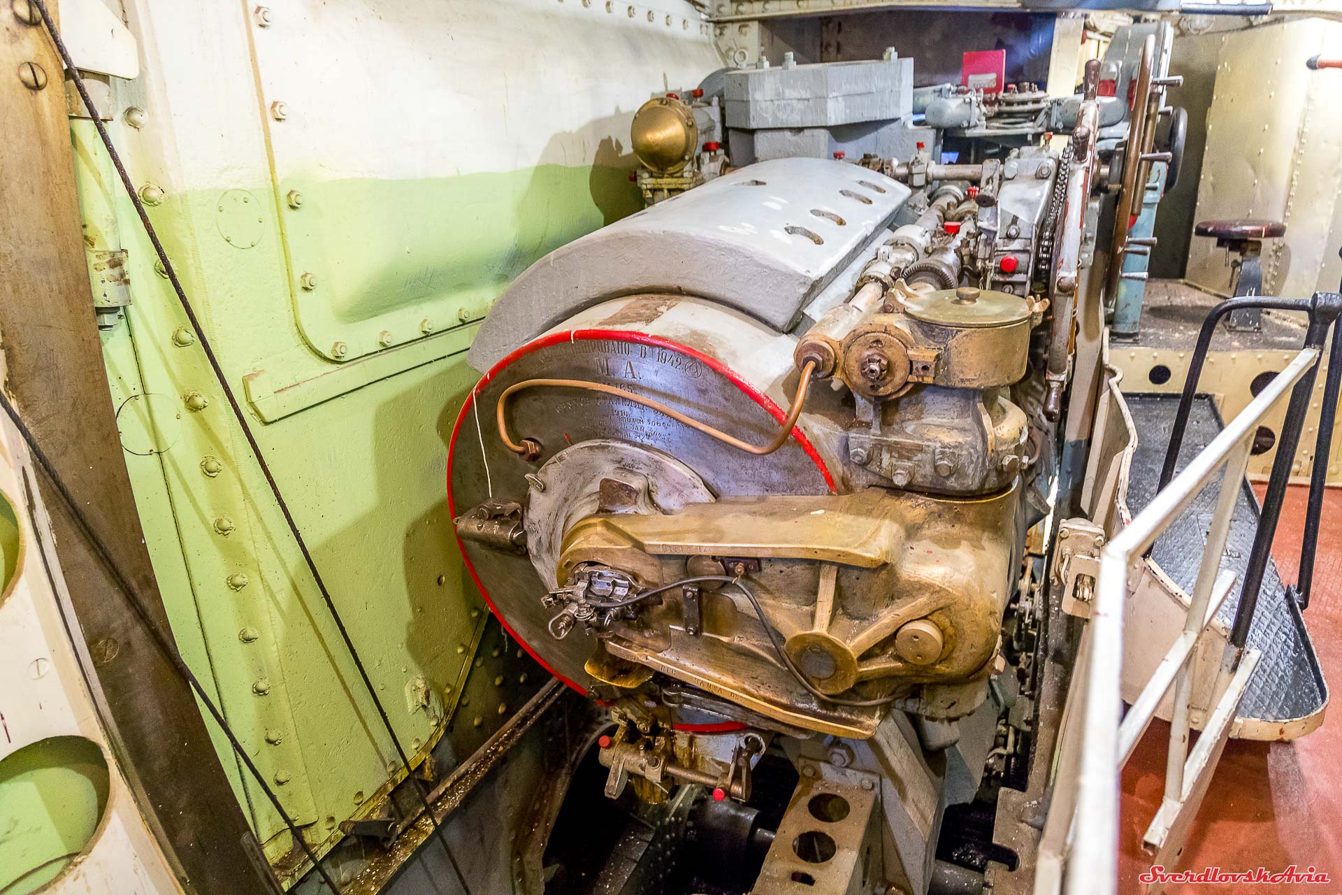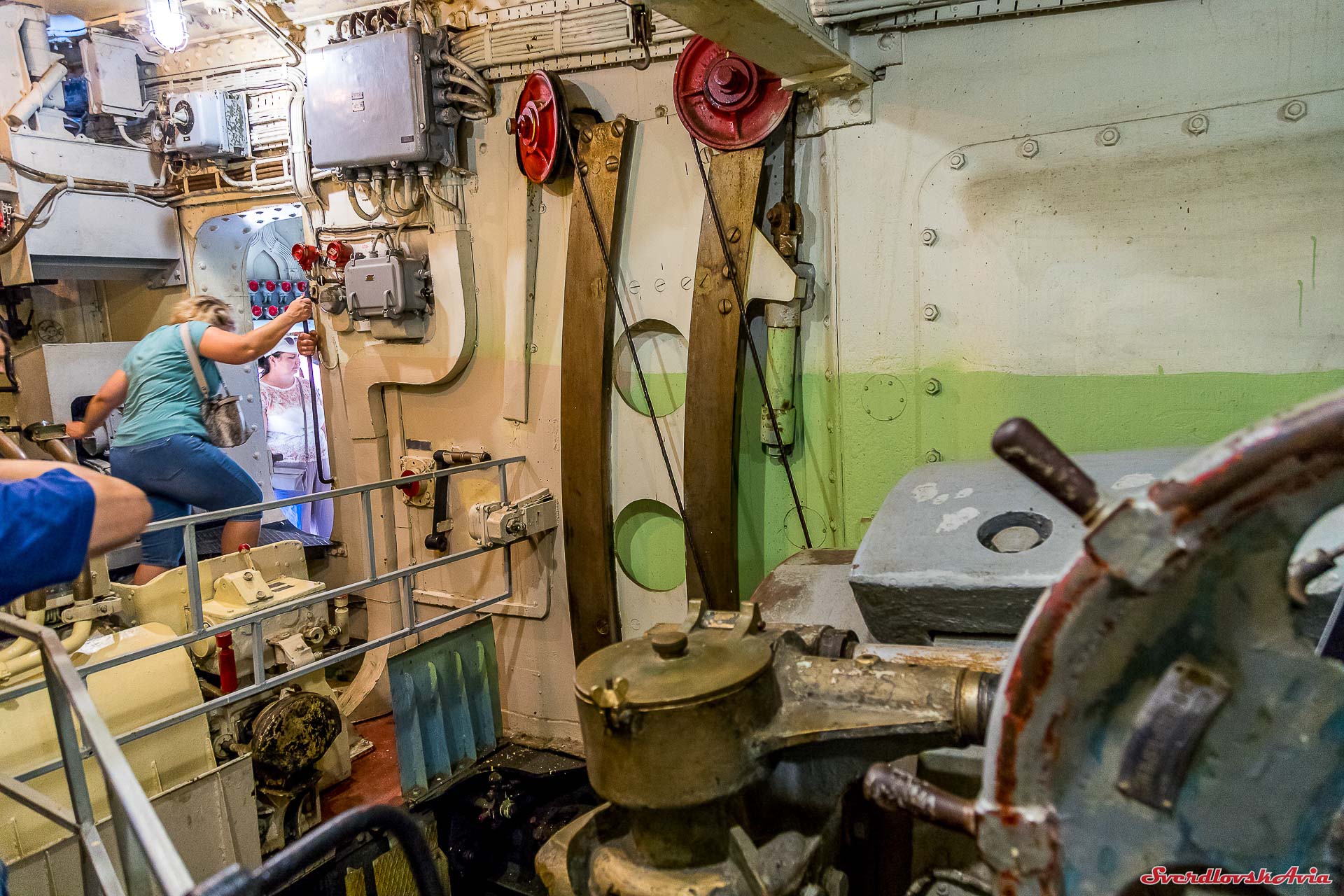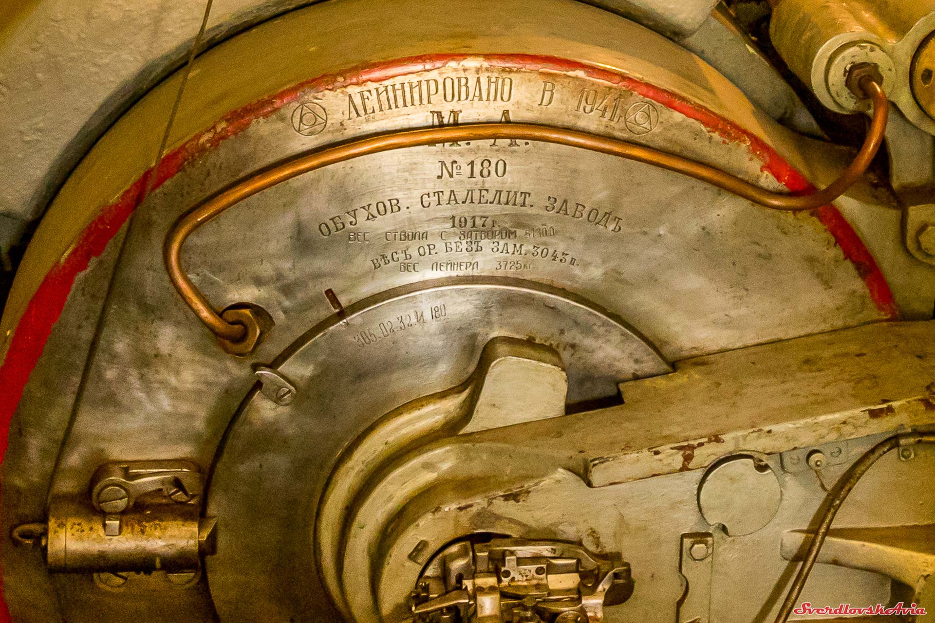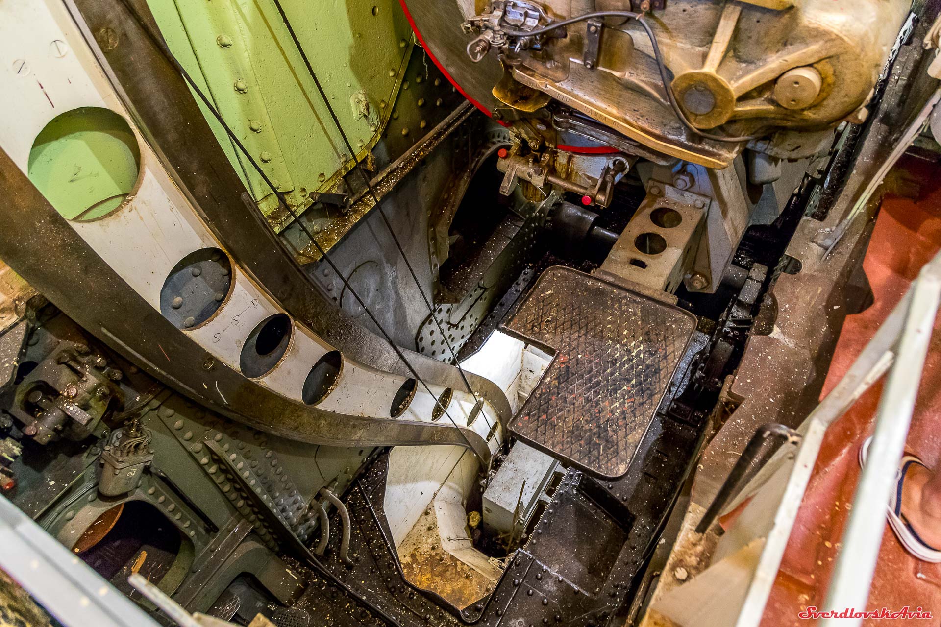 В отсеке левого орудия №85 (изготовлено 1914 году) расположено рабочее место горизонтального наводчика башни, в дальнем левом углу видно его стул, перед которым стоит штурвал, похожий на руль троллейбуса. Ближе пробраться к сожалению не получилось). Башня вращается на +\-185 градусов от директрисы стрельбы.