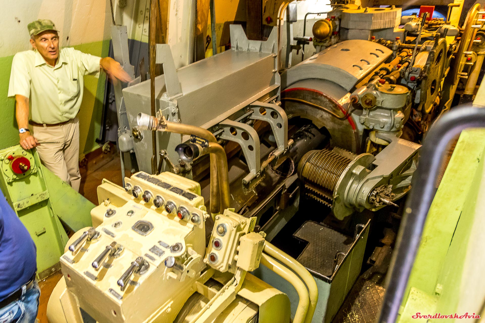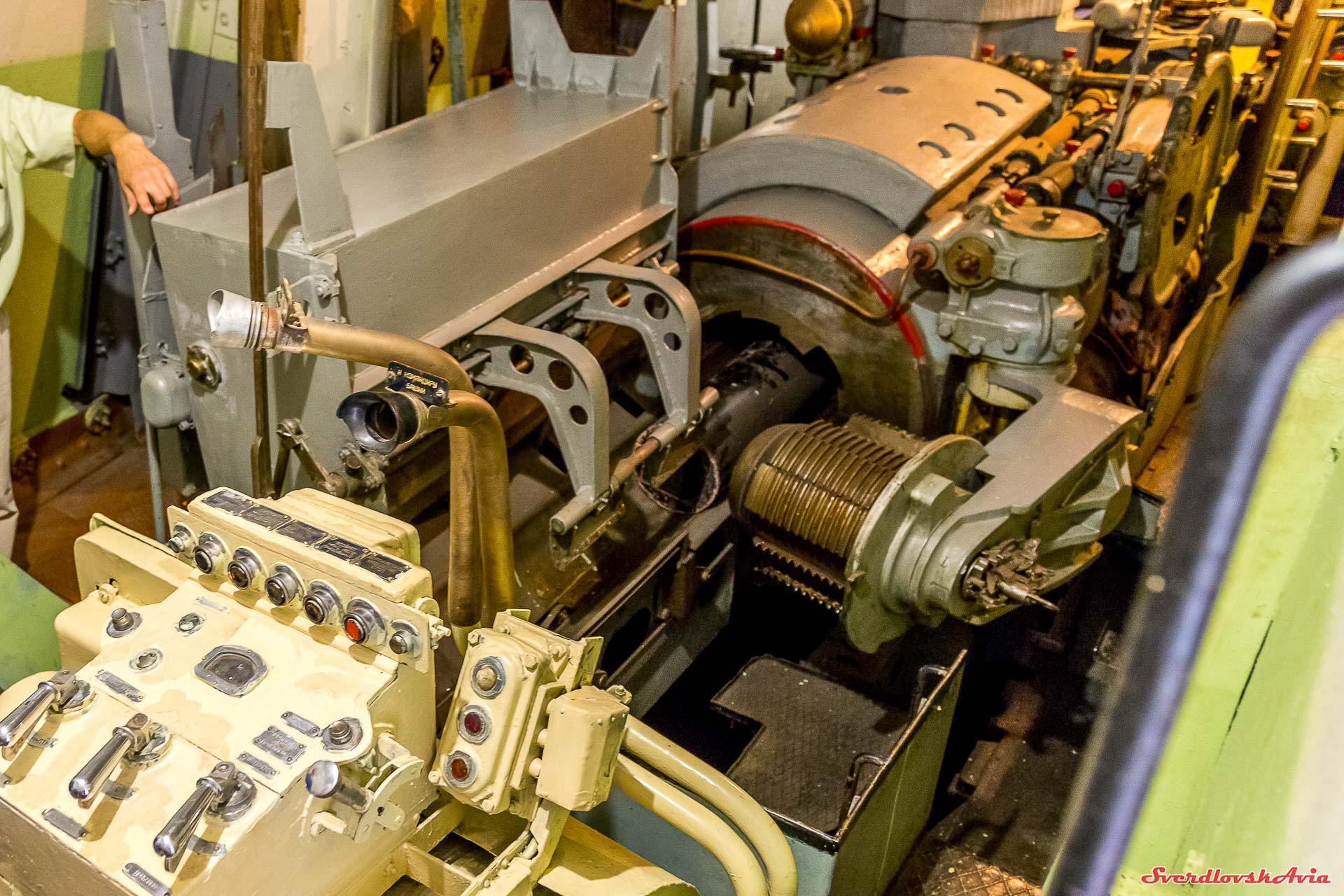 За ними, в правом углу расположено место вертикального наводчика правого орудия, на котором установлен принимающий прибор угла вертикального наведения № 44. Внизу штурвал электромеханического привода вертикального наведения, для поднятия ствола на нужный угол.