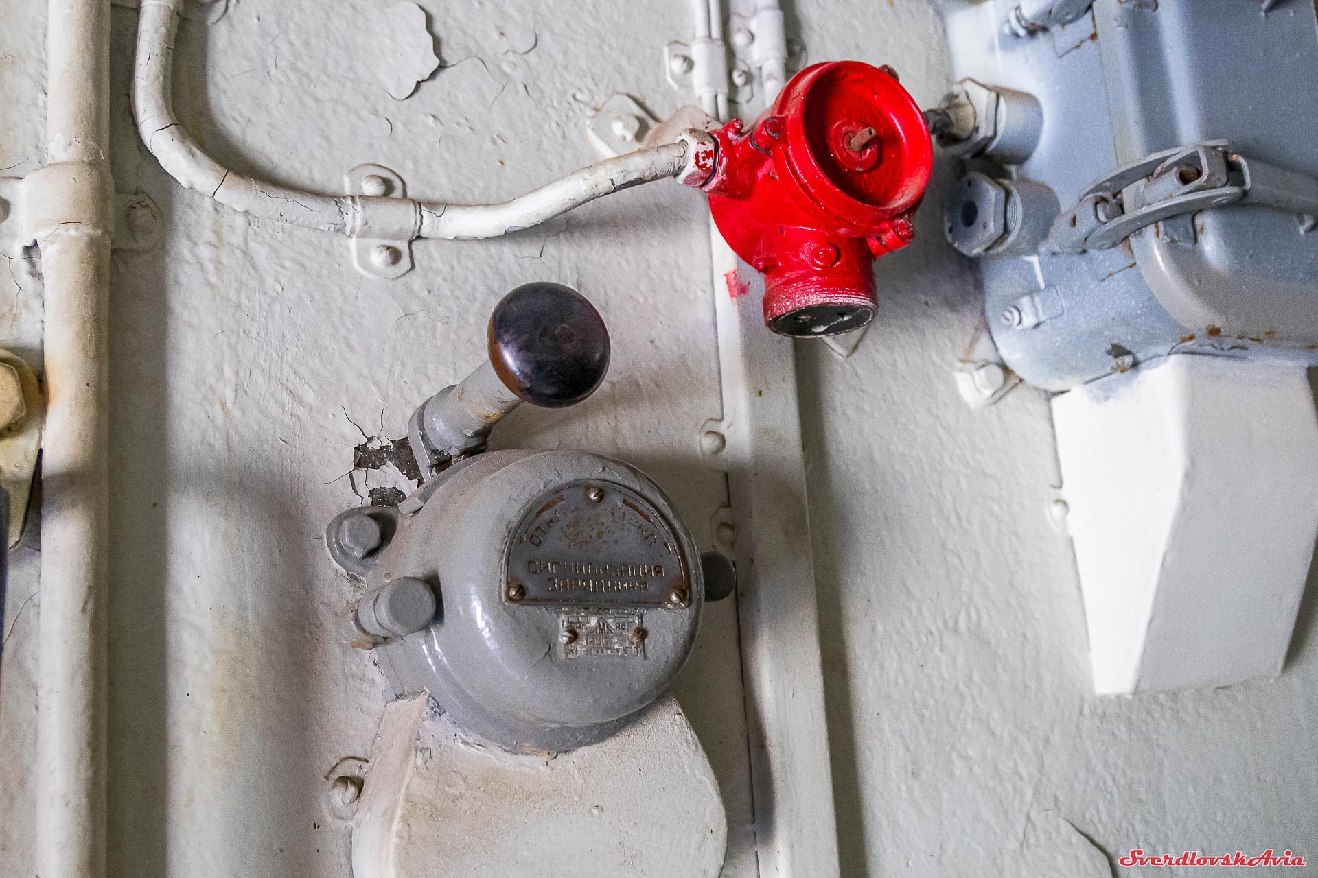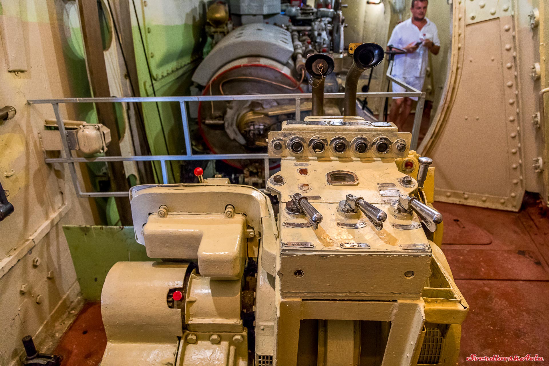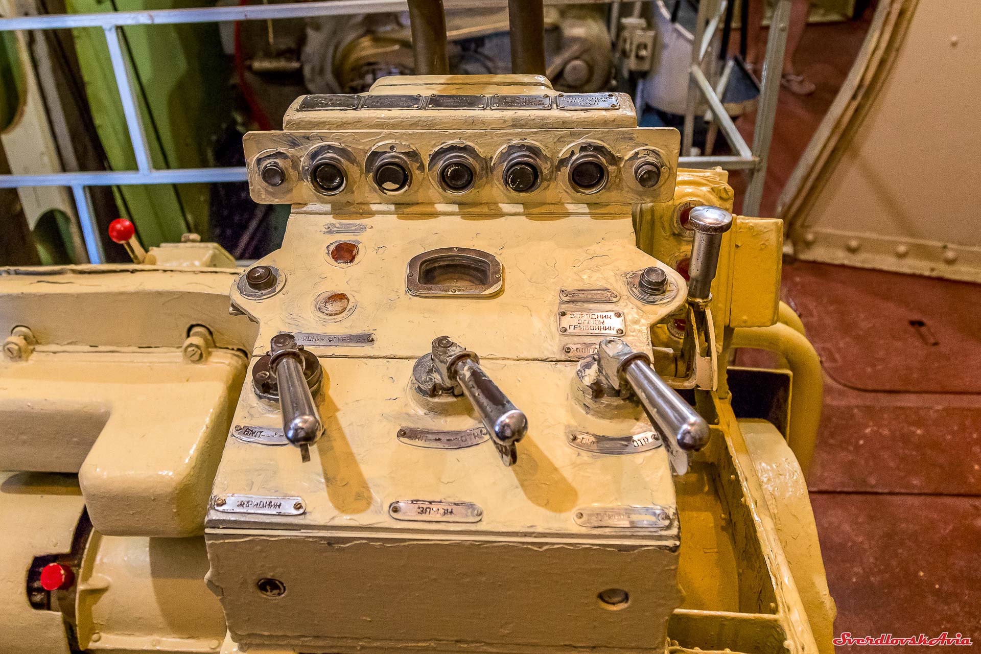 Перед ним установлен аналогичный пост управления механическим процессом заряжания орудия и механизм привода прибойника. Над панелью управления расположены переговорные трубы.
