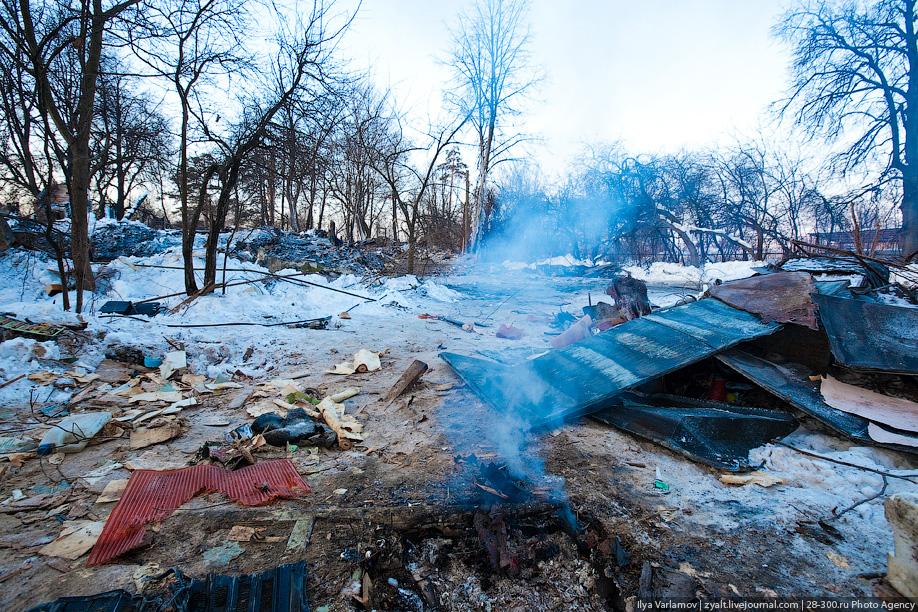 Сегодня он приехал в 7 утра посмотреть, что осталось. На территории не было ни ожного человека. На дороге стоял милицейский УАЗик. Как только я вышел, он подъехал, из него вышел милиционер и решил запретить "снимать сарай". Напомню, в январе, когда милиционер мешать снимать, меня выручили 200 рублей. Сегодня обошелся силой слова.