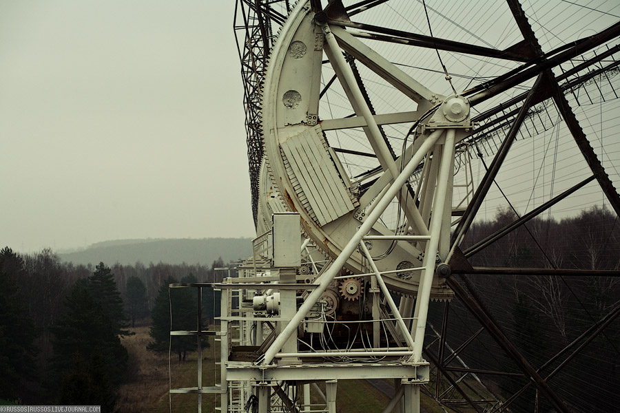 Территория телескопа обнесена плотным железобетонным забором, и в детстве мы туда лазили. Были байки, что если там находиться больше часа, то начёшь лысеть))) Ещё там были рельсы по всей длинне антенны, и стояла тачанка, бедный сторож замучился сгонять с неё))
