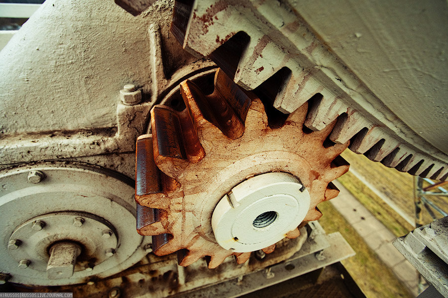Шестерня редуктора привода управления углом наклона. Поворот происходит достаточно медленно, ведь все 37 моторов должны работать синхронно. Величина рассинхронизации выводится на контрольный пульт управления.
