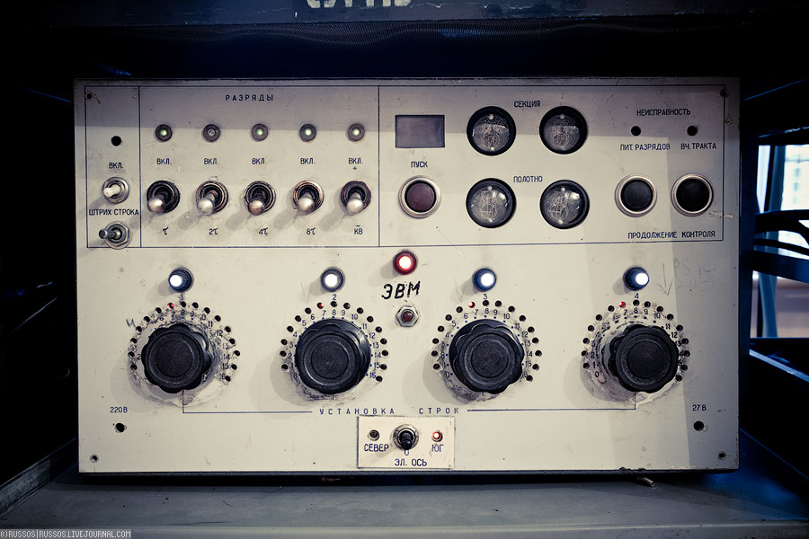 ЭВМ smile.gif Точнее, не сама ЭВМ, а небольшой блок управления антенной БСА — позволяет переключать ее направление на небе в «ручном» режиме (набором тумблеров и рукояток на панели), либо — на управление от ЭВМ (сейчас как раз и горит индикатор ее работы). Раньше за надписью ЭВМ скрывалась М-6000 (70-е годы), потом — МЕРА-125 (80-е годы), сейчас -обычная персоналка. А вот сама надпись маркером на блоке — как написали ее в 70-х, так она и осталась...