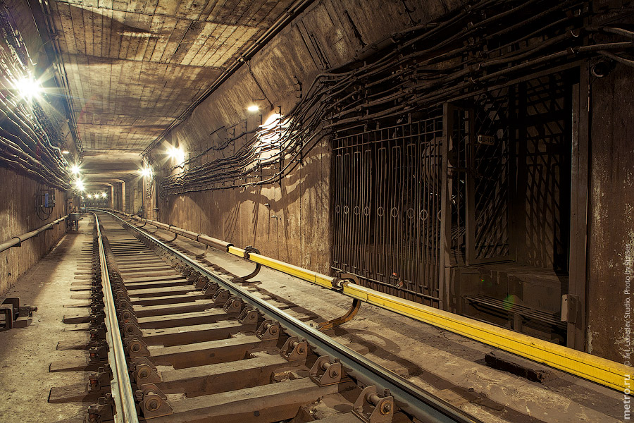 Мимо внезапно проехал мотовоз. Если присмотреться к потолку, то можно увидеть границу двух участков. Ближний к нам строили горным способом, а при постройке дальнего были использованны кессоны. Т.е. три секции тоннеля были сооружены на поверхности, а потом опущены на проектную глубину.