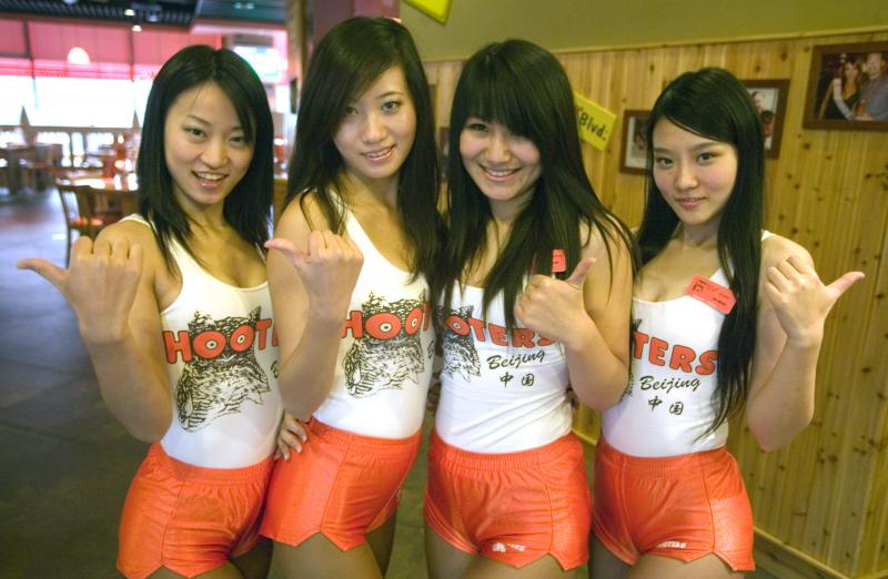 2. Китайские официантки ресторана «Hooters» позируют для фотографии в первом пекинском ресторане «Hooters». «Hooters» имеет два «филиала» в Китае и предлагает своим клиентам американское меню – холодное пиво, куриные крылышки. Как и в американской сети тут можно увидеть официанток в обтягивающих маечках и коротеньких шортиках. (UPI Photo/Stephen Shaver)