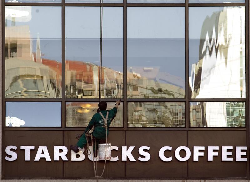 13. Китайский рабочий-мигрант моет кофейню «Starbucks» в центре Пекина. (UPI Photo/Stephen Shaver)