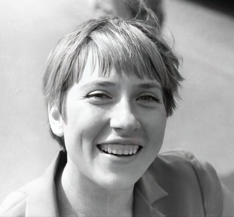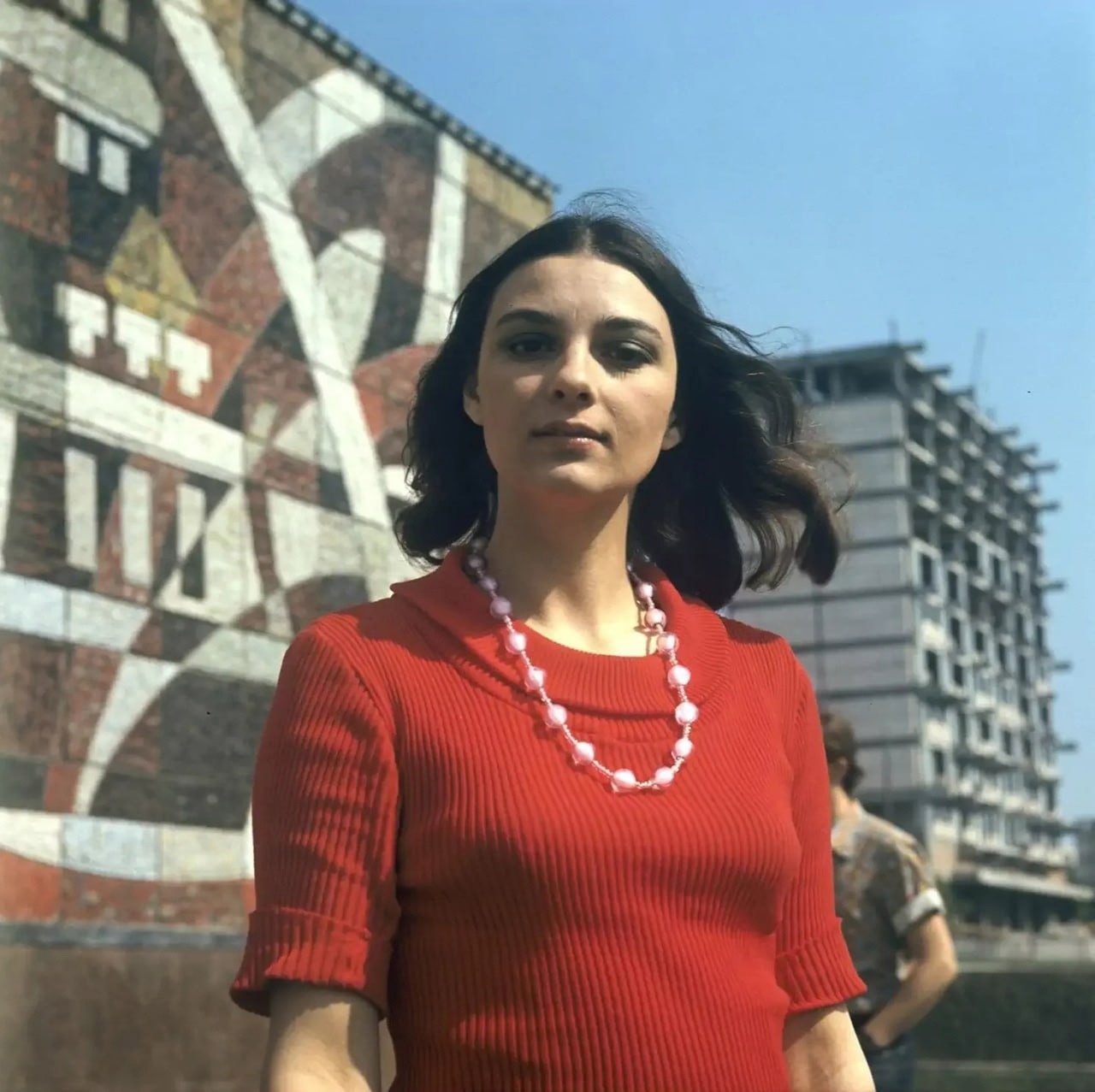 23.Светлана Тома позирует на фоне мозаичного панно «Искусство» 1970-е