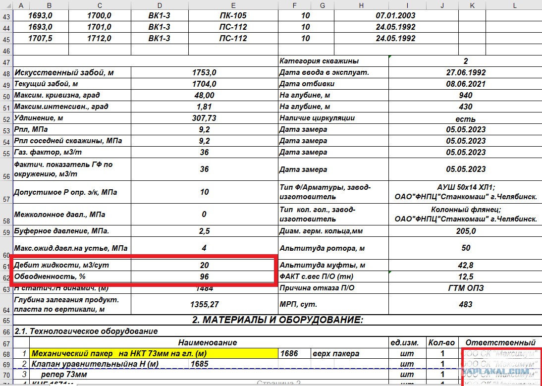 В обведенном красном прямоугольнике указан дебит скважины - 20 м3 в сутки. Это тот объем водонефтяной эмульсии, который из нее получается"выжать" в сутки. Такой дебит называется дебит по жидкости.