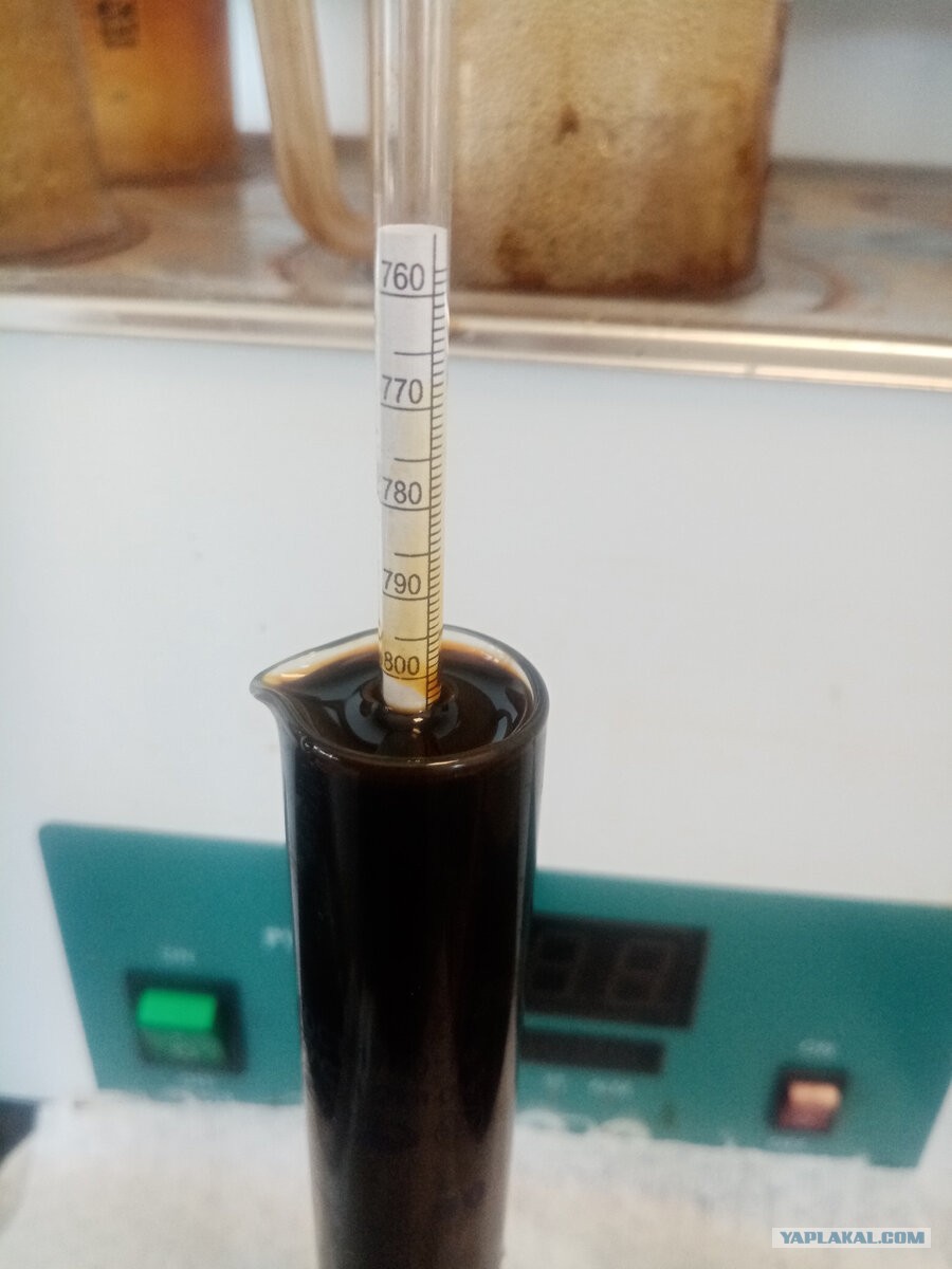 Теперь подсчитаем, сколько это будет в тоннах, потому что в России дебит по нефти измеряют в тоннах. Возьмем ареометр и замерим плотность. Так как у нас сырая нефть, то измеряют по нижнему мениску, как и прочие темные нефтепродукты.