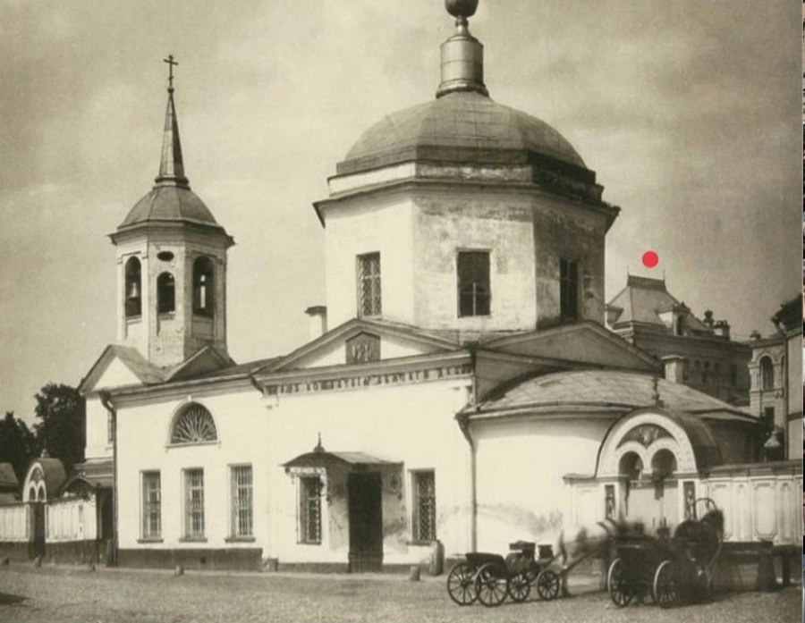 На углу Страстной площади (сейчас Пушкинской), где когда-то стояли Тверские ворота, в конце 1790-х поставили новую каменную церковь Великомученика Димитрия Солунского. При императоре Николае Павловиче она была перестроена, однако старую звонницу, возведенную еще при царе Алексее Михайловиче, трогать не стали, уж больно красивой была.