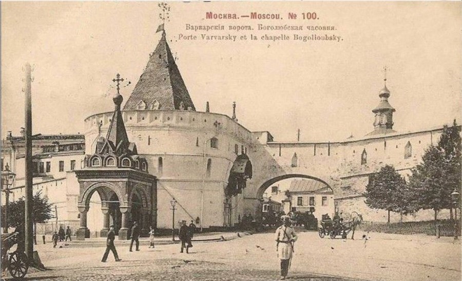 Варварские ворота Китайгородской стены, сооруженны в 1530-х годах. Рядом стоит Боголюбская часовня. Под башней был целый подземный этаж, зодчие даже выложили огромные камеры — «слухи» — слушать, не делает ли неприятель подкоп. При Александре II ворота и башня были отреставрированы, а в 1934 году без жалости снесены. Единственное, что уцелело со старого снимка, — сильно изуродованная Иоанно-Предтеченская церковь.