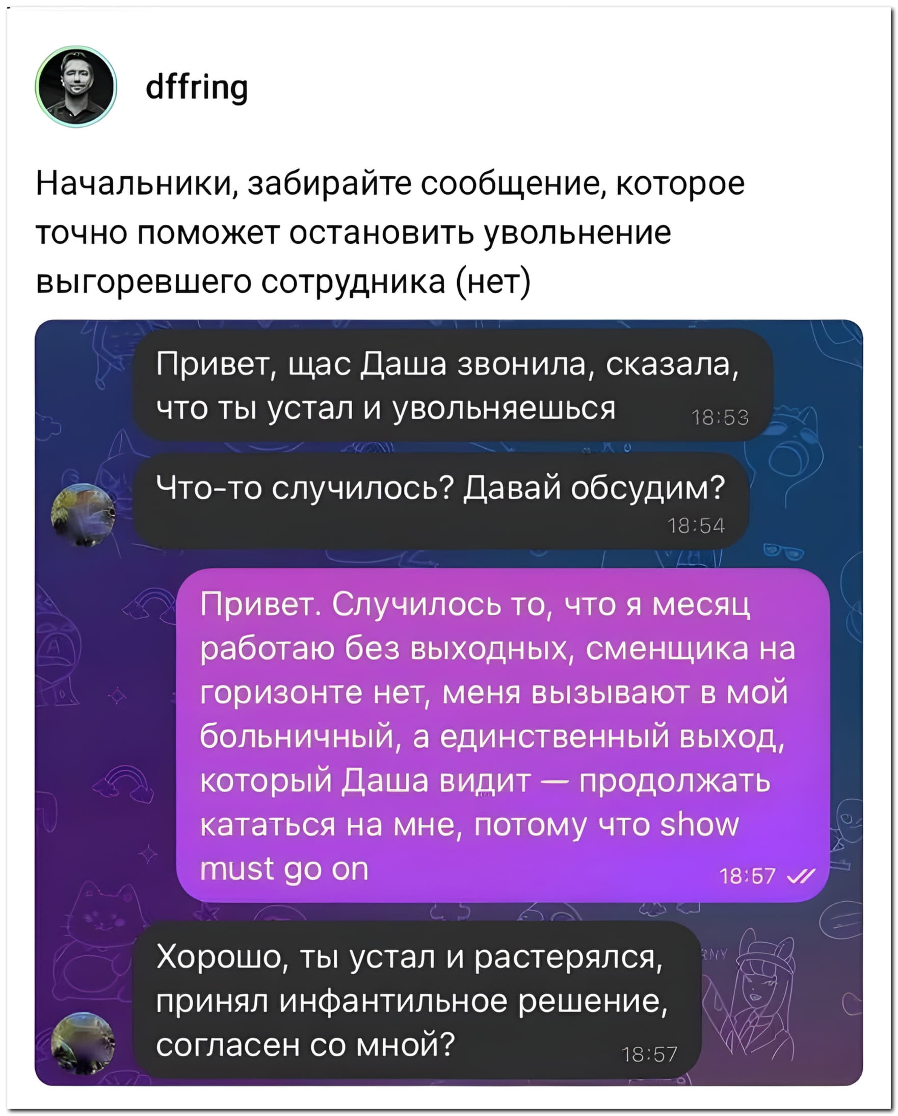 Я неоднократно заявлял, что сверхурочно оставаться не буду и в выходные тем более. Начальник, а это " говно" когда делать будешь? Я говорю, точно не сейчас.
