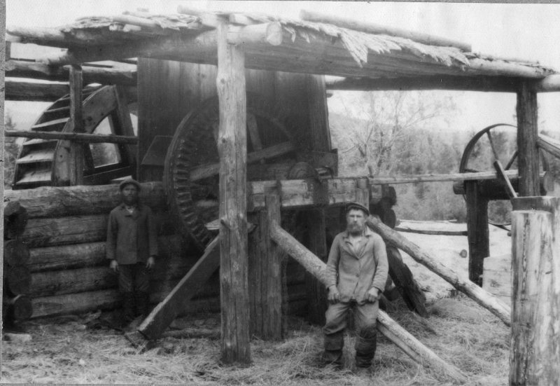 Подпись: Колхозники братья Рогалевы с товарищами, в недавнем времени богобоязненные староверы, построили для колхоза на оросительной канаве водяное колесо, передаточные шестерни для молотилки, просорушки и мельницы. 1926 г.