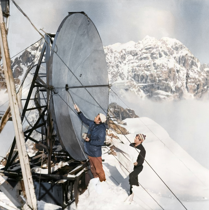 10 Инженеры Киргизского радио-телецентра настраивают антенну ретрансляционной станции "Южная", расположенной на одной из вершин Тянь-Шаня, 1974 год.  В. Лазарев