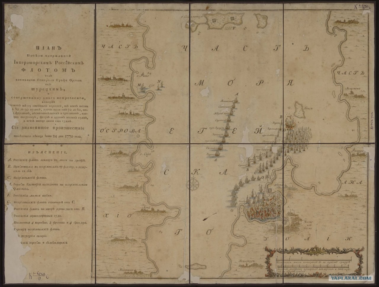 Отменно отличился господин Ильин, который подошел к турецкому кораблю с полным экипажем находящемся, на глазах их положил брандскугель в корабль, и зажегши брандер возвратился безо всякой торопливости с присутствием духа, как и прочие, назад. Тут уже увидели вдруг, в разных местах загоревшийся флот неприятельский, узрели и победу свою совершенную