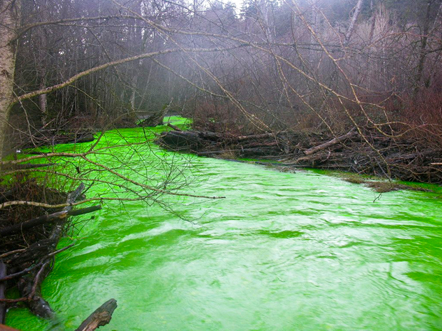 В США город Чикаго есть какой-то праздник, они в этот день в воду какой то краситель насыпают и она зелене зелене становится.