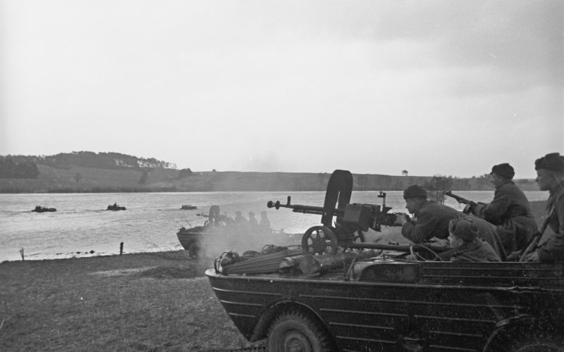 Расчеты 12,7‑мм крупнокалиберных пулеметов ДШК, установленных на автомобилях-амфибиях американского производства Ford GPA, поддерживают огнем форсирование реки подразделениями одного из отдельных моторизованных батальонов особого назначения 1-го Белорусского фронта. Авторское название «Бой у водного рубежа». Место съемки: Польша. Время съемки: октябрь 1944 г. Автор фото: Ефим Копыт