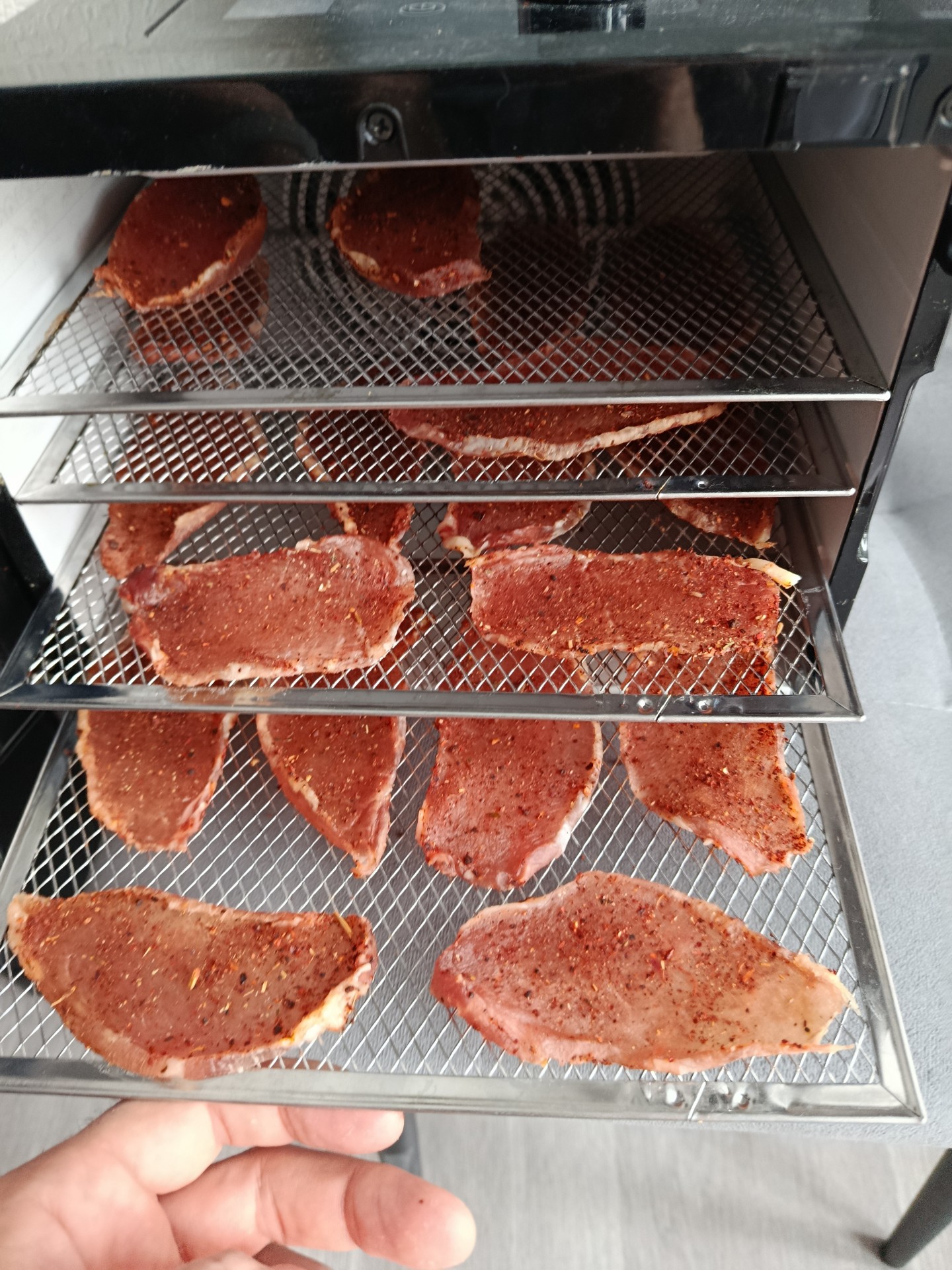 Ещё и рыбу сушу в таком. Летом 100% мухи не лезут. Ставлю не более 35 градусов. С мясом так же температуру, не выше. Ну грибы-абрикосы понятно, тоже в ней.