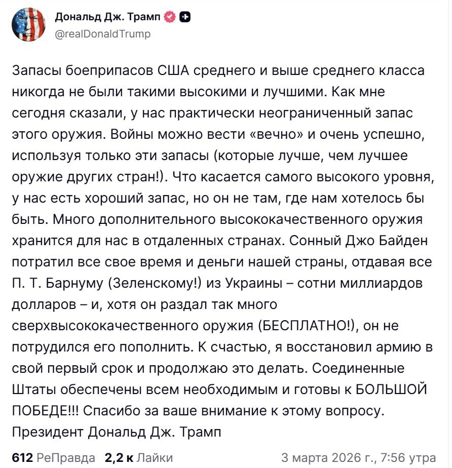 У США «практически неограниченное» количество боеприпасов среднего и большого калибра, заявил Трамп.