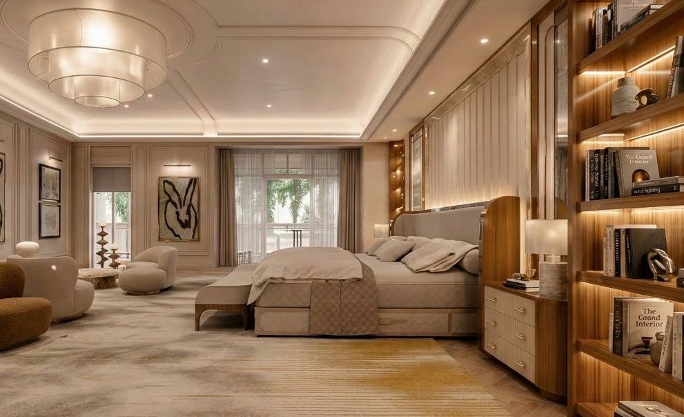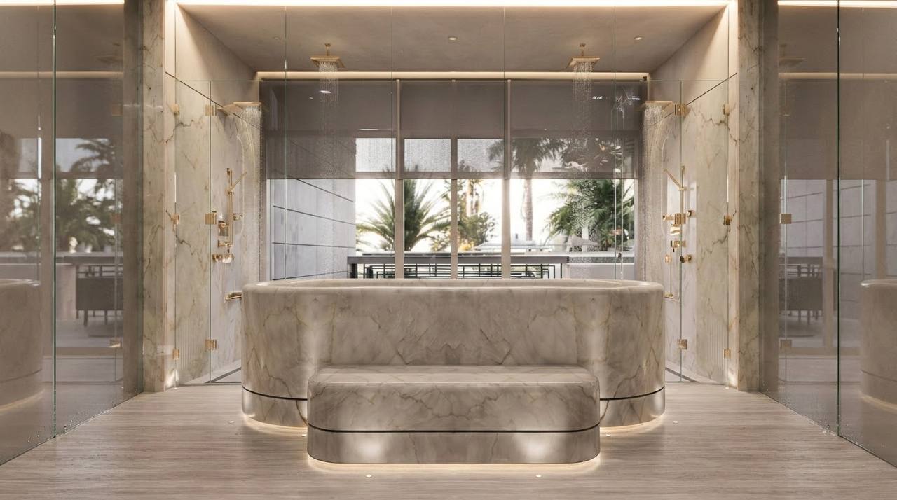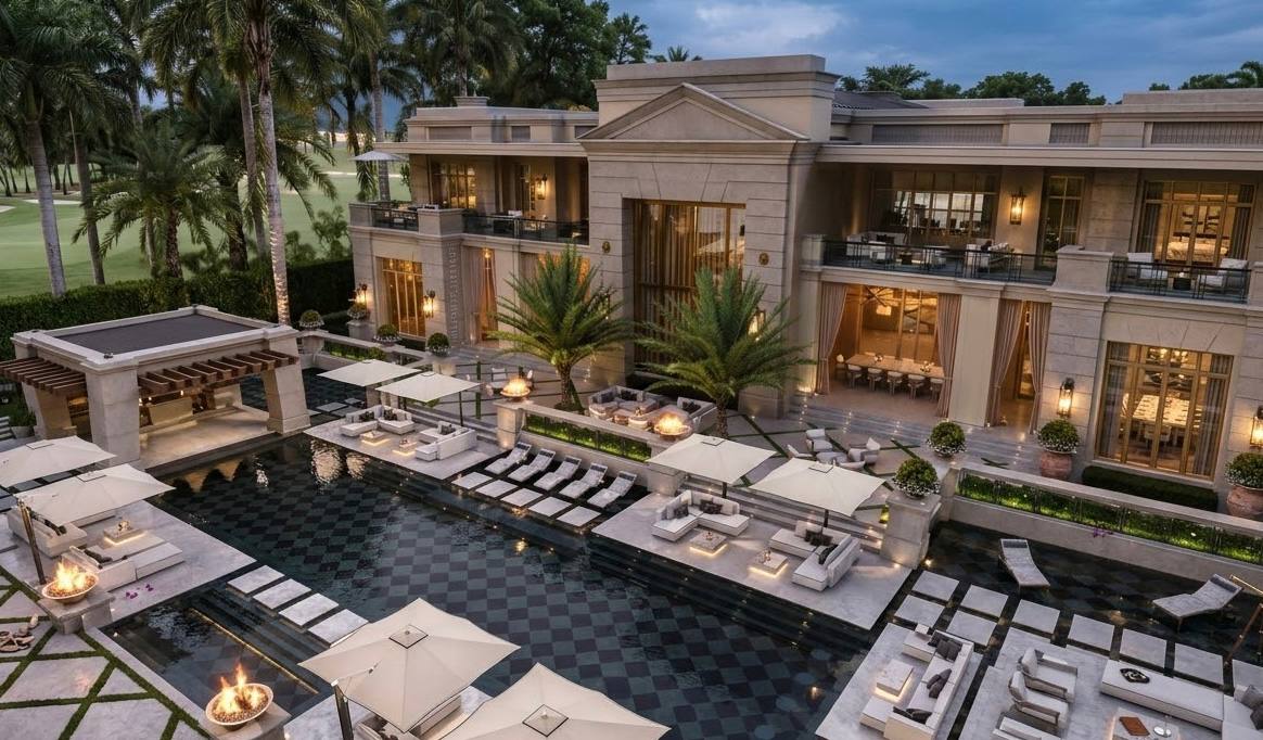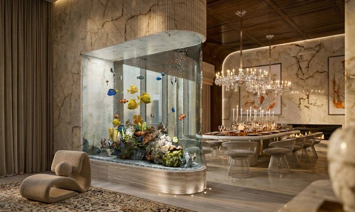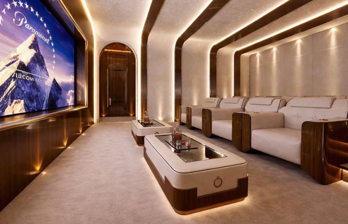 Дом ещё строится, но параметры уже понятны. Площадь — 2 780 м². 9 спален. 15 ванных комнат. Собственный причал. Аквариум. Спа-зона. Спорт-зал. Отдельная кухня под шефа.