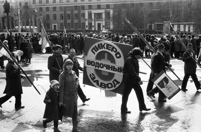 Рабочие ликеро-водочного завода на демонстрации 1 мая. 1980-е