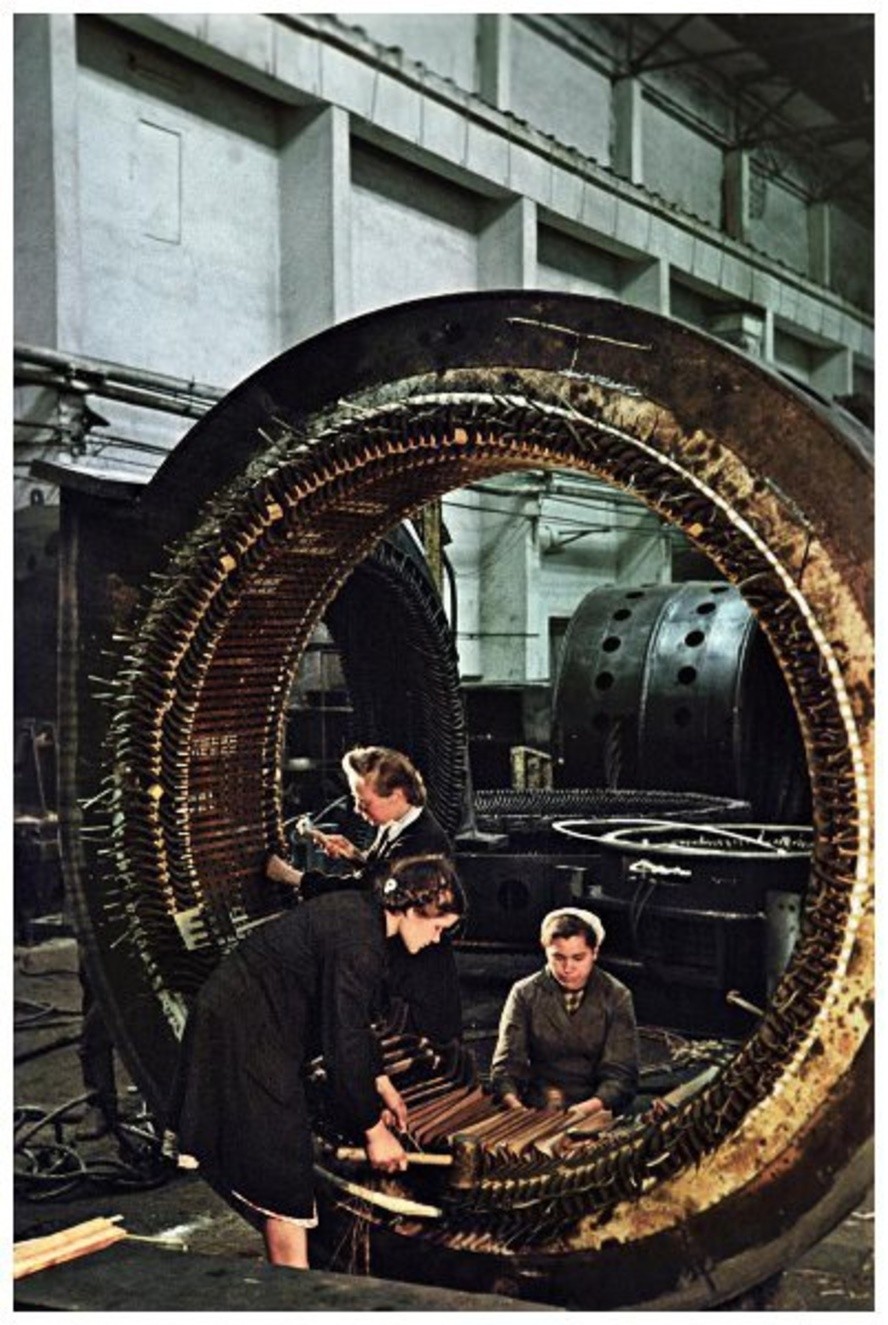 15.Бригада изолировщиц завода «Уралэлектроаппарат»: Аня Хромцова, Сима Первушина и Нина Маклакова за изолировкой статора синхронной машины. 1950 год.