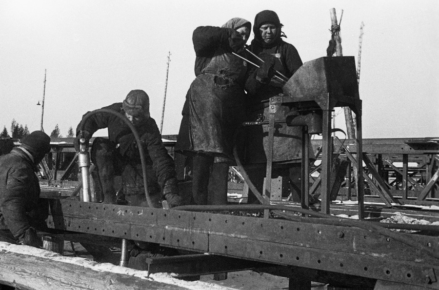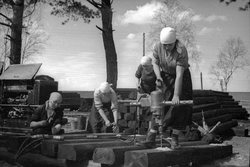 20.Строительство железной дороги в районе Вязьмы. Сверловка шпал. 1930-е. Автор: Александр Устинов.
