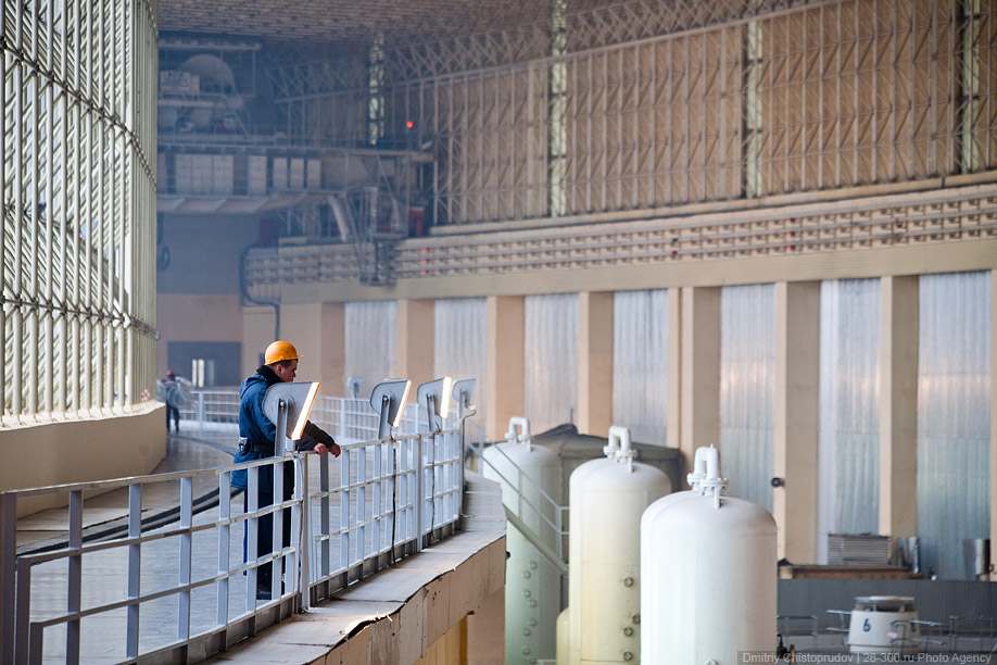 2. Здание машинного зала ГЭС впечатляет — почти 300 метров в длину. На правой части панорамы видно участок крыши, который был восстановлен после аварии.