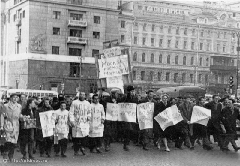 "Снимок сделан 15 апреля 1961г. Я в то время принимал непосредственное участие в шествии именно этой колонны Киевского р-на на Красную плошадь, что-бы лично увидеть на трибуне Гагарина. Пожалуй, это был единственный раз, когда в колонны демонстрантов свободно "вливались" широкие слои трудящихся, без какого-либо ограничения. Встреча Первого в Мире Космонавта СССР настолько была скоротечно организована, что художники не успели подготовить большие транспоранты с портретом Ю.А.Гагарина, но цветные открытки с улыбающимся ст. лейтинантом ВВС моментально продавались или просто раздавались на каждом углу по пути следования колонн всех районов г.Москвы. Радости ликования,сияющих от улыбок,слез радости и гордости за свою РОДИНУ лиц, с тех пор я больше никогда не видел! И что еще запомнилось, это Манежная площадь, где сливались колонны и среди демонстрантов было огромное количество иностранцев с цветами и открытками с лицом Гагарина!"