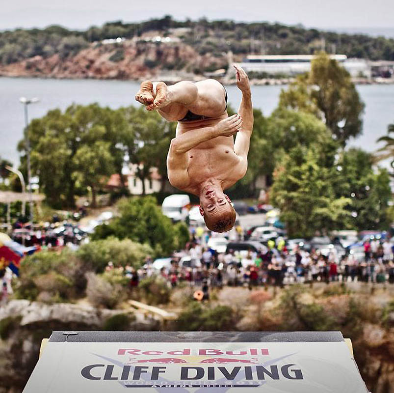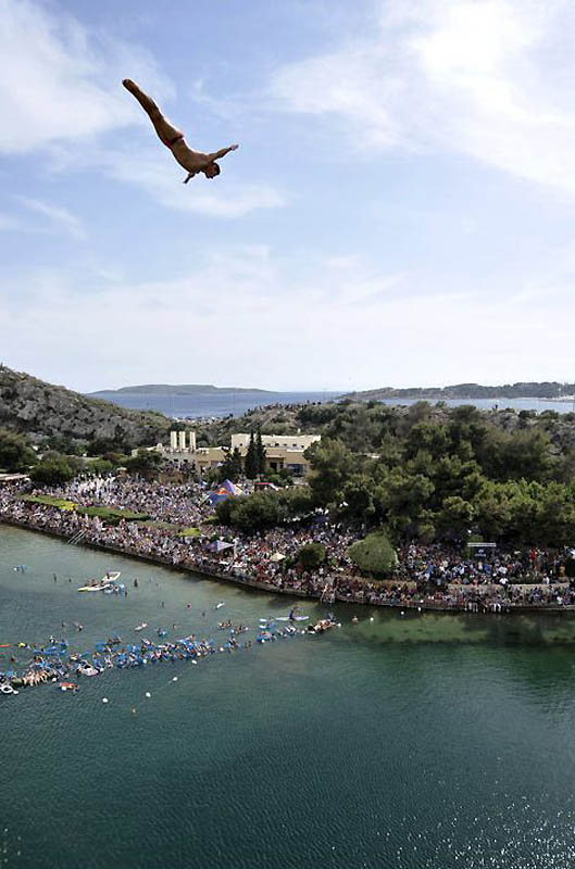 Алайн Кол из Люксембурга прыгает с 26,8-метрового трамплина на озере Вулиагмени в Греции на третьем этапе турнира «Red Bull Cliff Diving World Series».