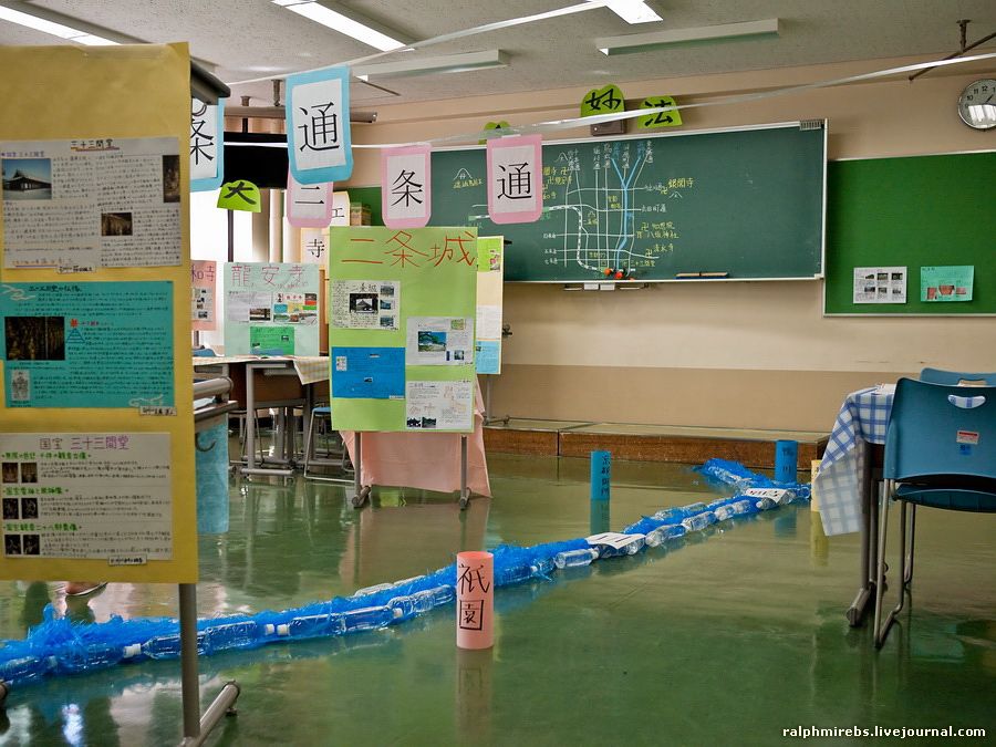 2. Обязательными из них является лишь младшая и средняя – в старшие идут лишь те, кто собирается в дальнейшем поступать в ВУЗ-ы, причем все старшие школы платные. Так-же школы делятся на муниципальные и частные. Частные дороже, но и богаче. Школа, куда я отправился, была школой (средняя и старшая) Японского Университета – уже знакомая мне так как в прошлом году я там уже был. Сперва я хотел подойти сразу к членам совета учащихся, но они выглядели очень занятыми, занимаясь раздачей памфлетов на входе, так что выбор пал на двух учениц первого года обучения старшей школы, мирно сидевших перед входом в свой класс-пиратский лабиринт. Несколько школьных интерьеров.