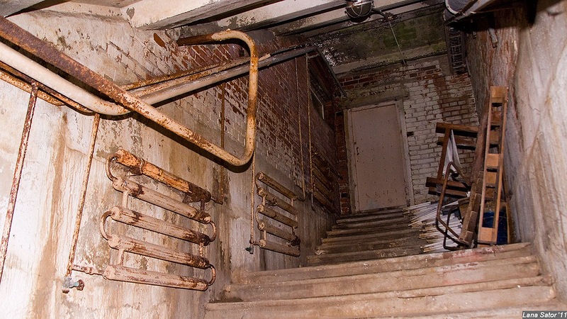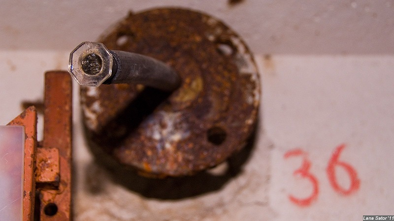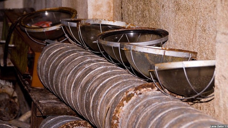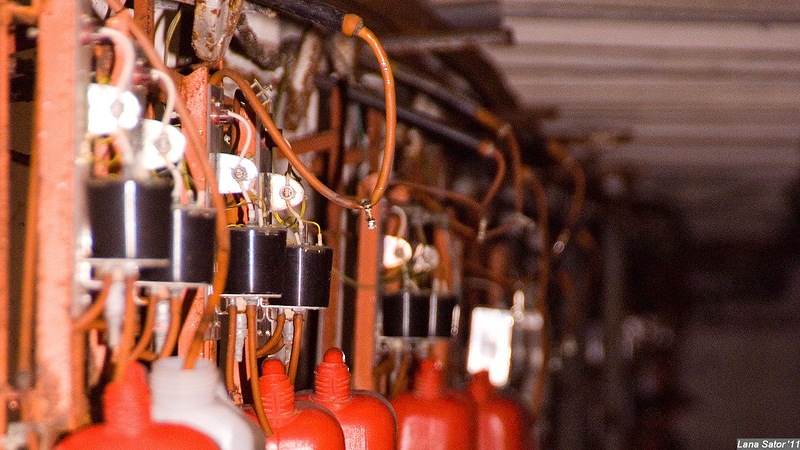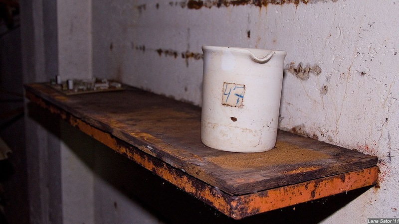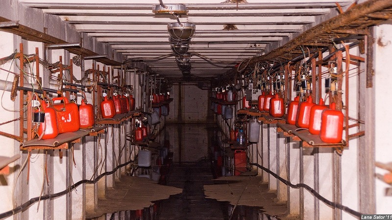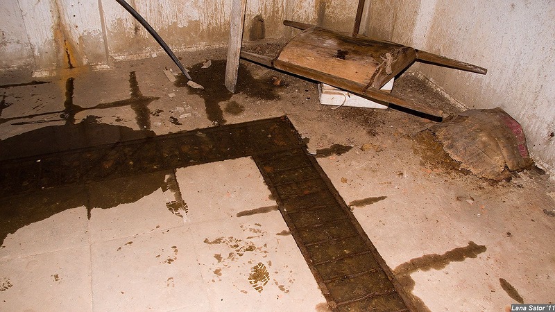 Вода выплескивается на дно прямоугольного ящичка со звуком "плюх" и утекает в трубку, после чего попадает в канистру. канистры многие переполнены, отчего выливающаяся лишка обрушивается на пол с характерным "пыщ".