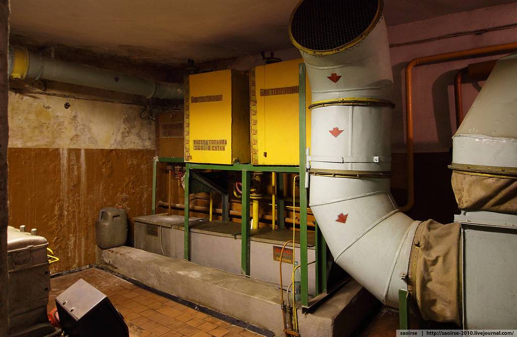 2. Начинаем тихо осматривать ближайшие помещения у нашего входа. Первые комнаты - технические. Это комната с ФВУ. Видно, что в убежище предусмотрено два режима работы установок в зависимости от того, что происходит сверху.