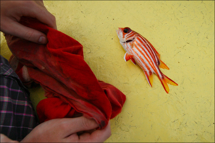 Он достаточно колюч, потому лучше снимать с крючка через тряпочку.