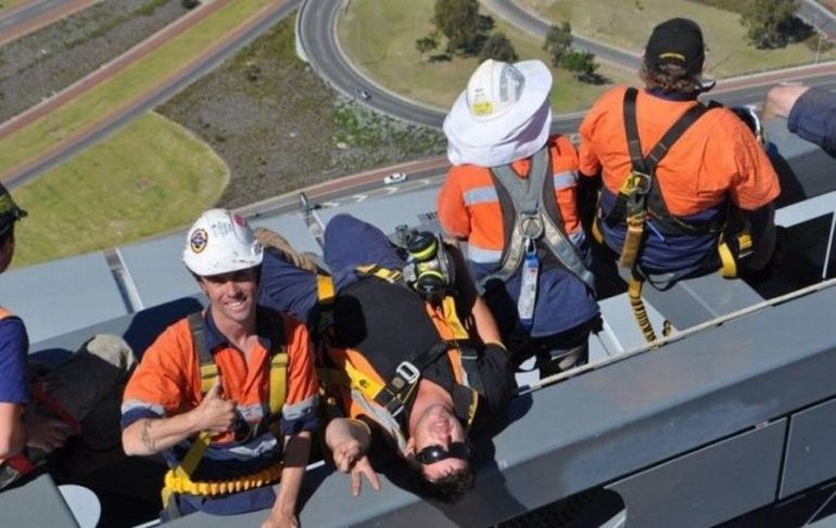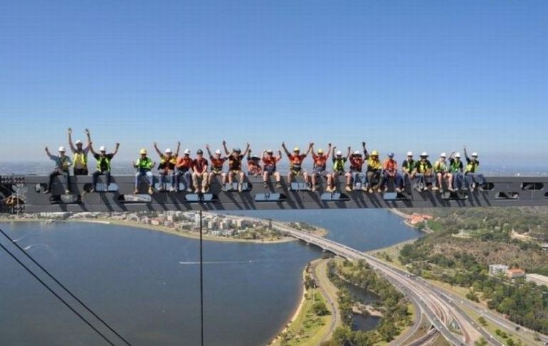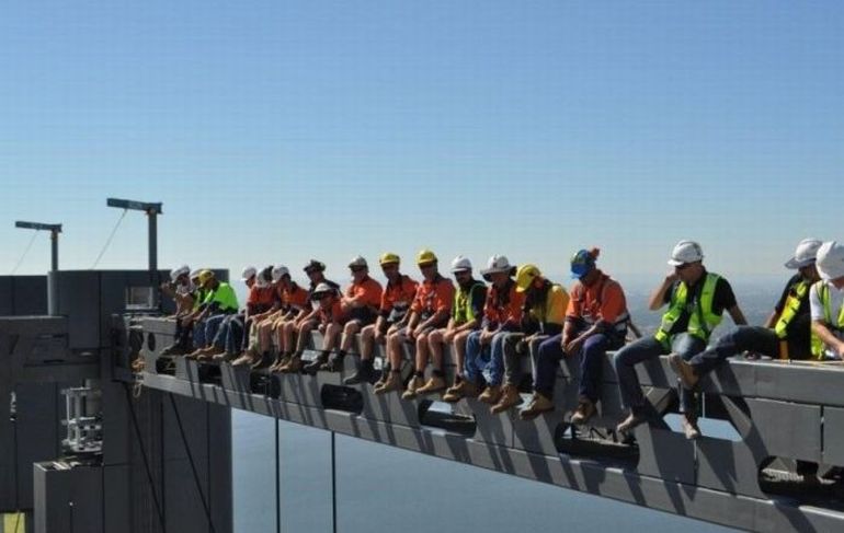 Австралийские рабочие повторили легендарную фотографию строителей Нью-Йорка, которые отобедали на высоте 240 метров.