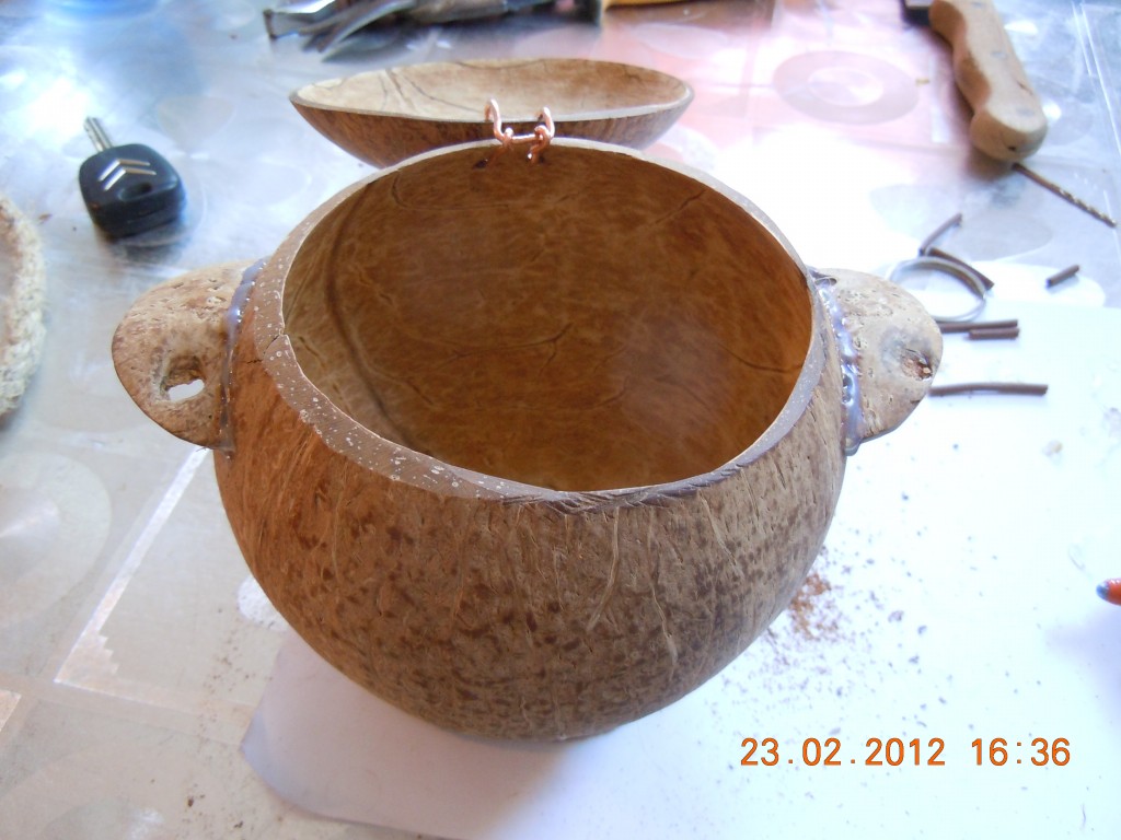 3. Крышка кстати говоря от другого кокоса. Та част, что была срезана с основного ореха пошла на ручки. Просто срезана была не аккуратно, не подходила на роль крышки ни как.