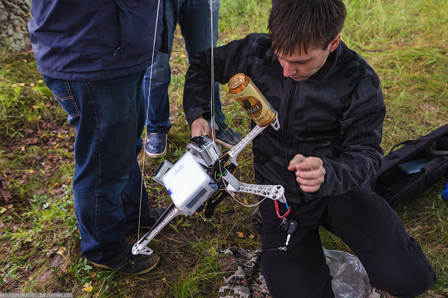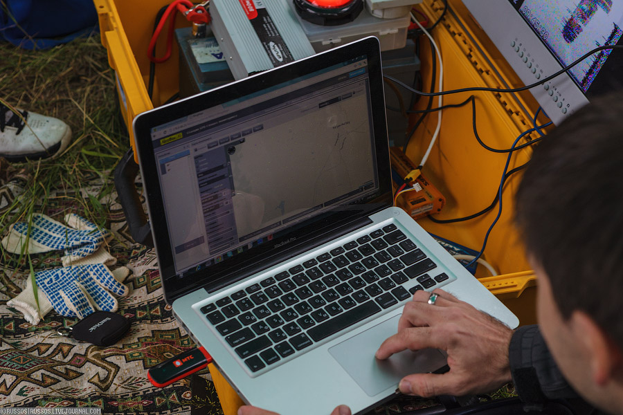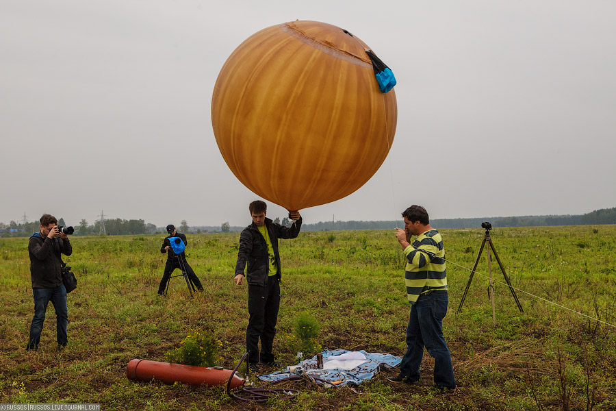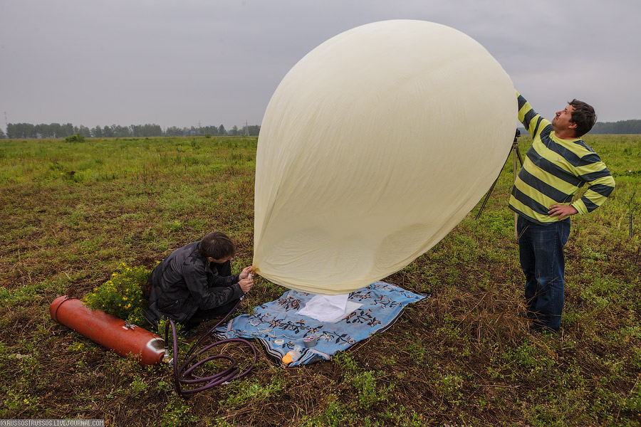 1. Группа запуска выехала на точку в ночь. За это время они нашли удобную локацию, подготовили часть оборудования и сами собрали «космические аппараты». Когда я приехал, то первый шар уже был надут гелием. Это американец, 1982 года выпуска. Он стоял на вооружении американской армии для запуска какого-то оборудования в стратосферу. А после списания стал доступен всем желающим. Темная полоса сверху — отрезанная юбка-парашют и система подвеса контейнера с оборудованием. К шару крепится парашют, который обеспечивает безопасный спуск оборудования, после того как шар лопнет под воздействием давления газа изнутри (атмосфера становится разреженной, и гелий разрывает шар). Теоретически это должно произойти на высоте в 20-30 километров.