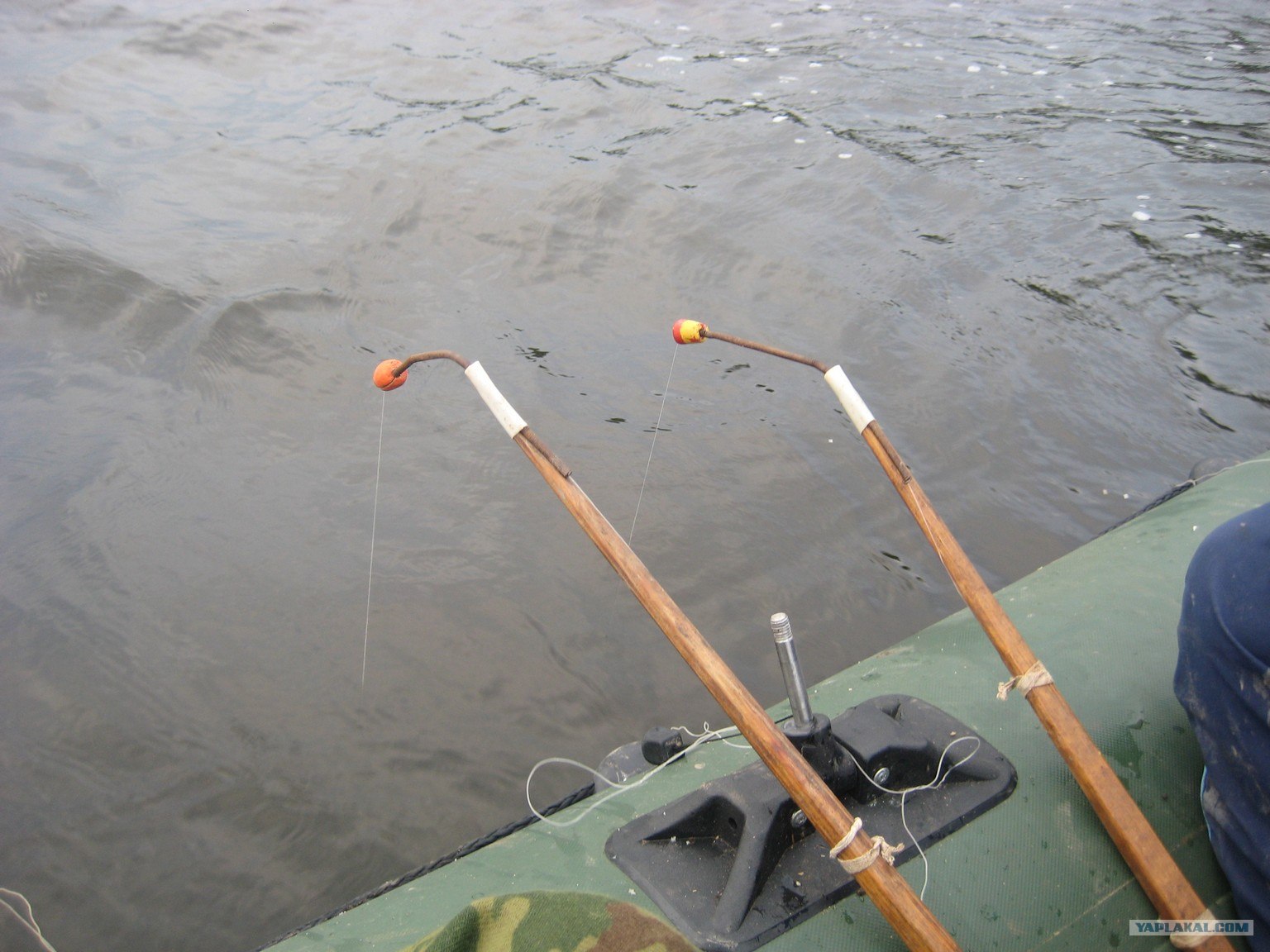 Закидываем кормушки. Ловить будем на "кольцовку". Для тех, кто не знает, рассказываю. На веревке, подальше от лодки, закидывается кормушка (подобие авоськи с грузом). Далее берется подобие зимней удочки, только в разы больше. На конце свинцовое кольцо с прорезью, ниже леска с несколькими поводками. Насаживается червь, кольцо одевается на веревку от кормушки и по ней спускается к кормушке.