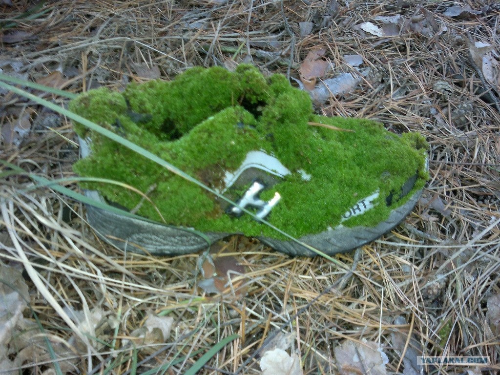 Оригинально, можно проанализировать "экологичность" некоторых материалов кроссовка. На нормальных материалах - вырос мох обильно. А на всяком буторе - даже мох не растёт