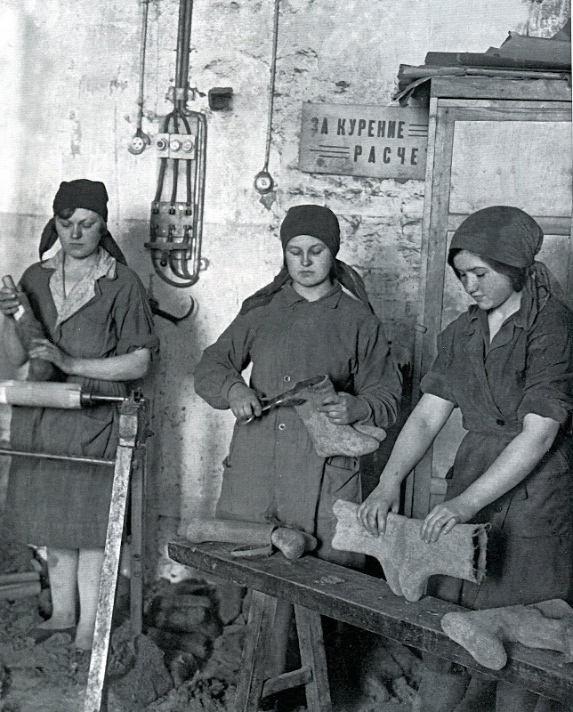 арная хозрасчётная бригада пошивочного цеха сапожной фабрики артели "Ударник" за работой.