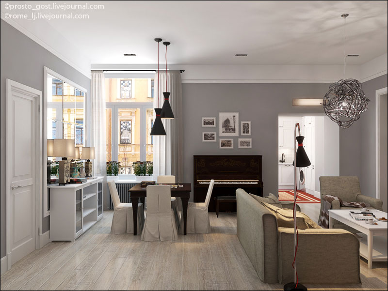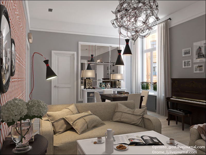 Гостиная. В помощь ущемленному окну для лучшей инсоляции предлагаю зеркальное панно: