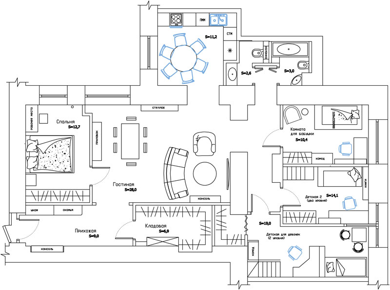 Ко мне обратилась талантливая, умная, известная, популярная - мама троих детей и заботливая дочь с вопросом: что можно сделать с квартирой, чтобы всему большому семейству было удобно? Квартира в старом фонде и запущенная. Лабиринты коридоров и трубопроводов. Площадь 127 кв.м.